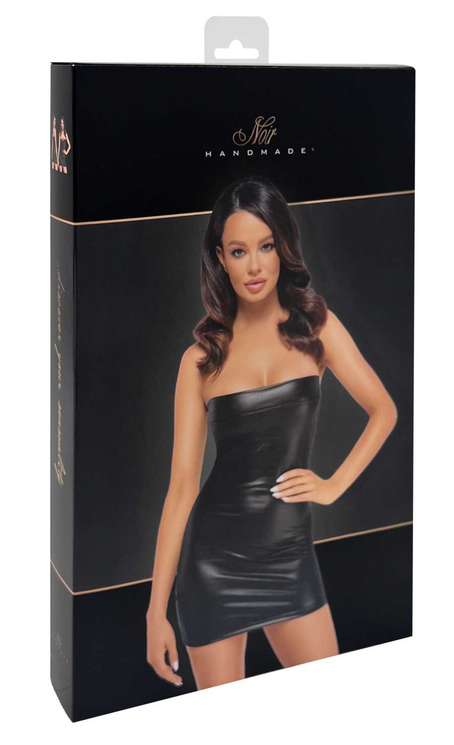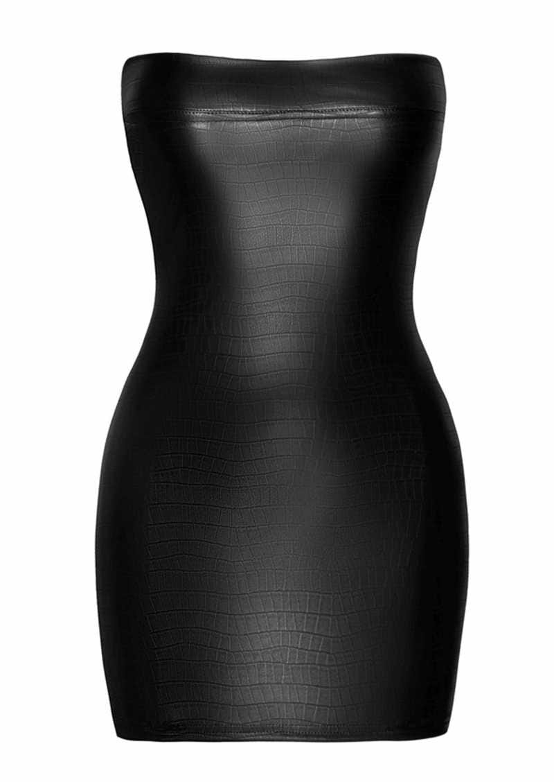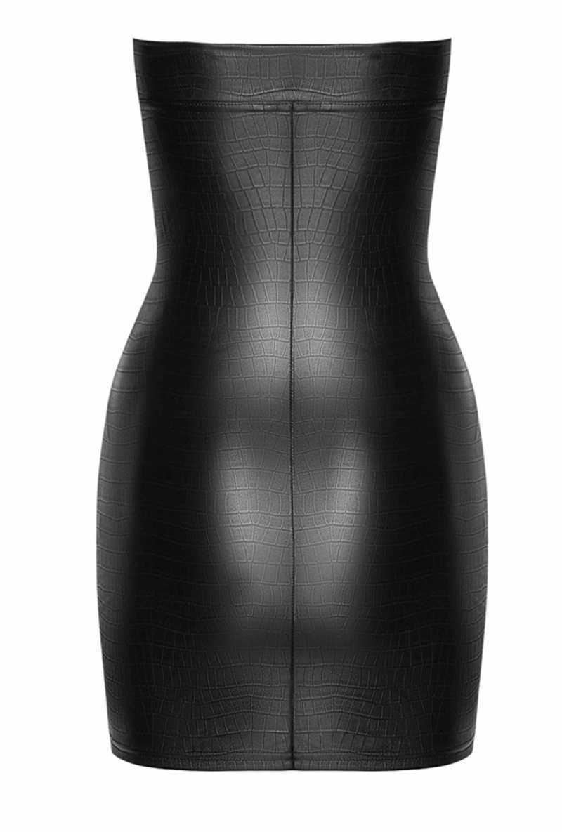 Zmysłowa i urzekająca, elegancka, klasyczna wersja mini sukienki bez ramiączek, w stylu wetlook, o fakturze imitującej skórę krokodyla.