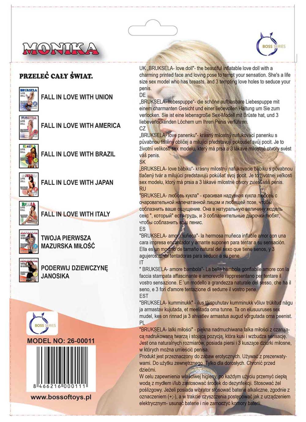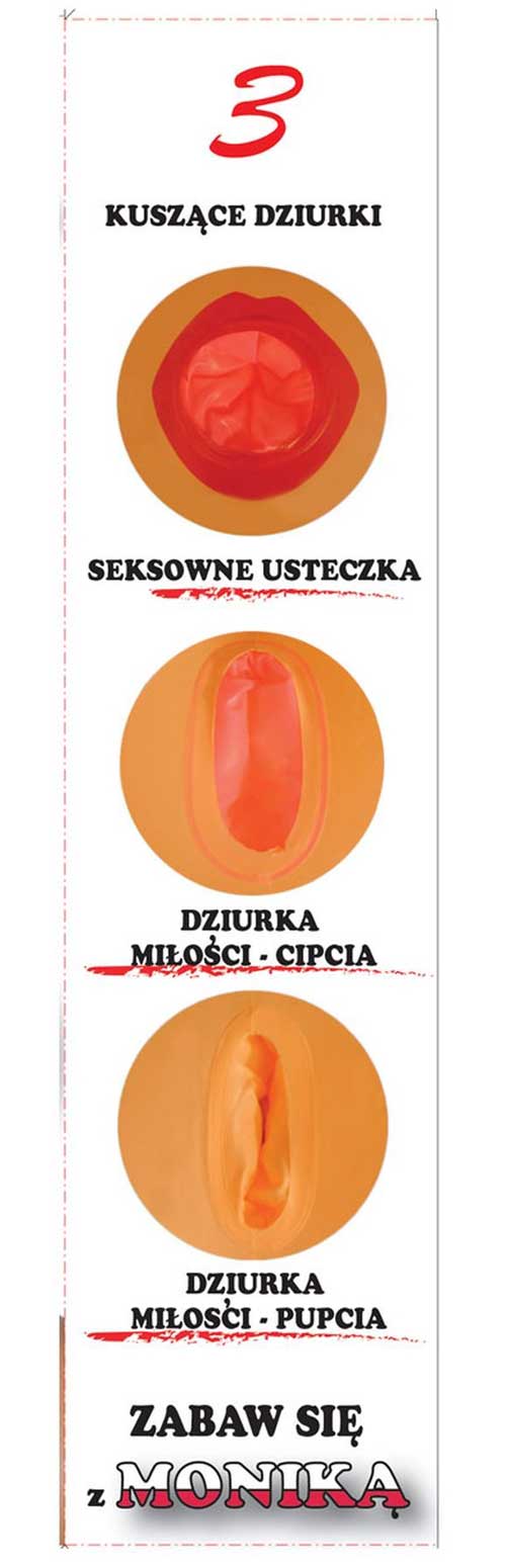 Monika to piękna blondynka, atrakcyjna lalka naturalnych rozmiarów. Posiada piersi oraz 3 dziurki miłości, usta, anus i waginę.