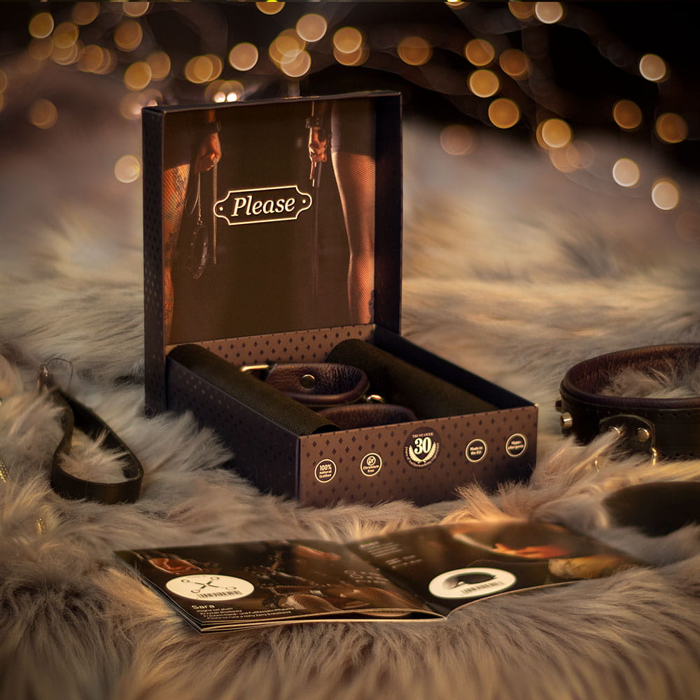 Eleganckie kajdanki przeznaczone do różnych form BDSM, wykonane z wysokiej jakości naturalnej skóry, wytrawianej naturalnymi środkami pochodzenia roślinnego. Elementy pozostające w kontakcie ze skórą są pozbawione niklu. Użycie dwóch kolorów skór powoduje, że kajdanki są pięknym przedmiotem rozbudzającym fantazję erotyczną.