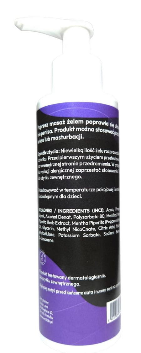 Sposób użycia: Nanieś niewielką ilość żelu na skórę prącia i delikatnie wmasuj, aż się wchłonie.