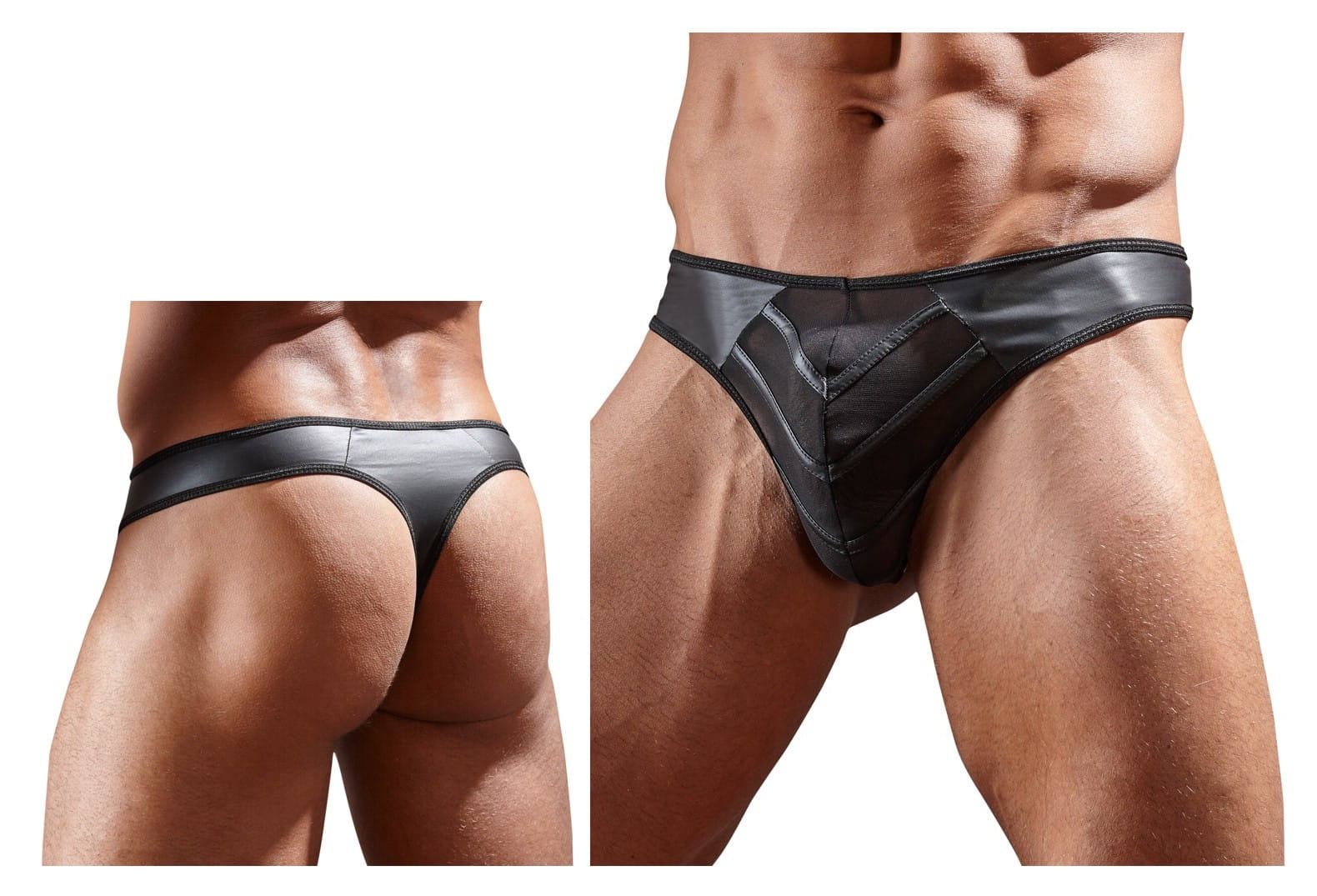 Czarne, szalenie seksowne męskie stringi wykonane z elastycznej matowej tkaniny w połączeniu z przezroczystymi, siateczkowymi wstawkami.