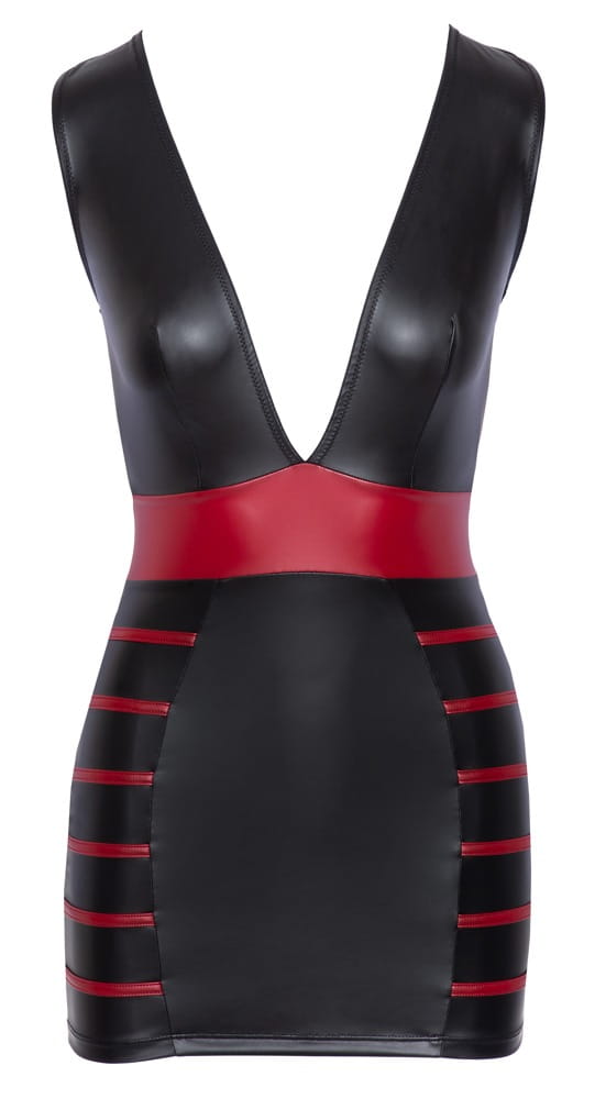 Dopasowana, krótka sukienka w czarnym, matowym kolorze z czerwonymi paskami po bokach spódnicy i czerwoną wstawką w talii.