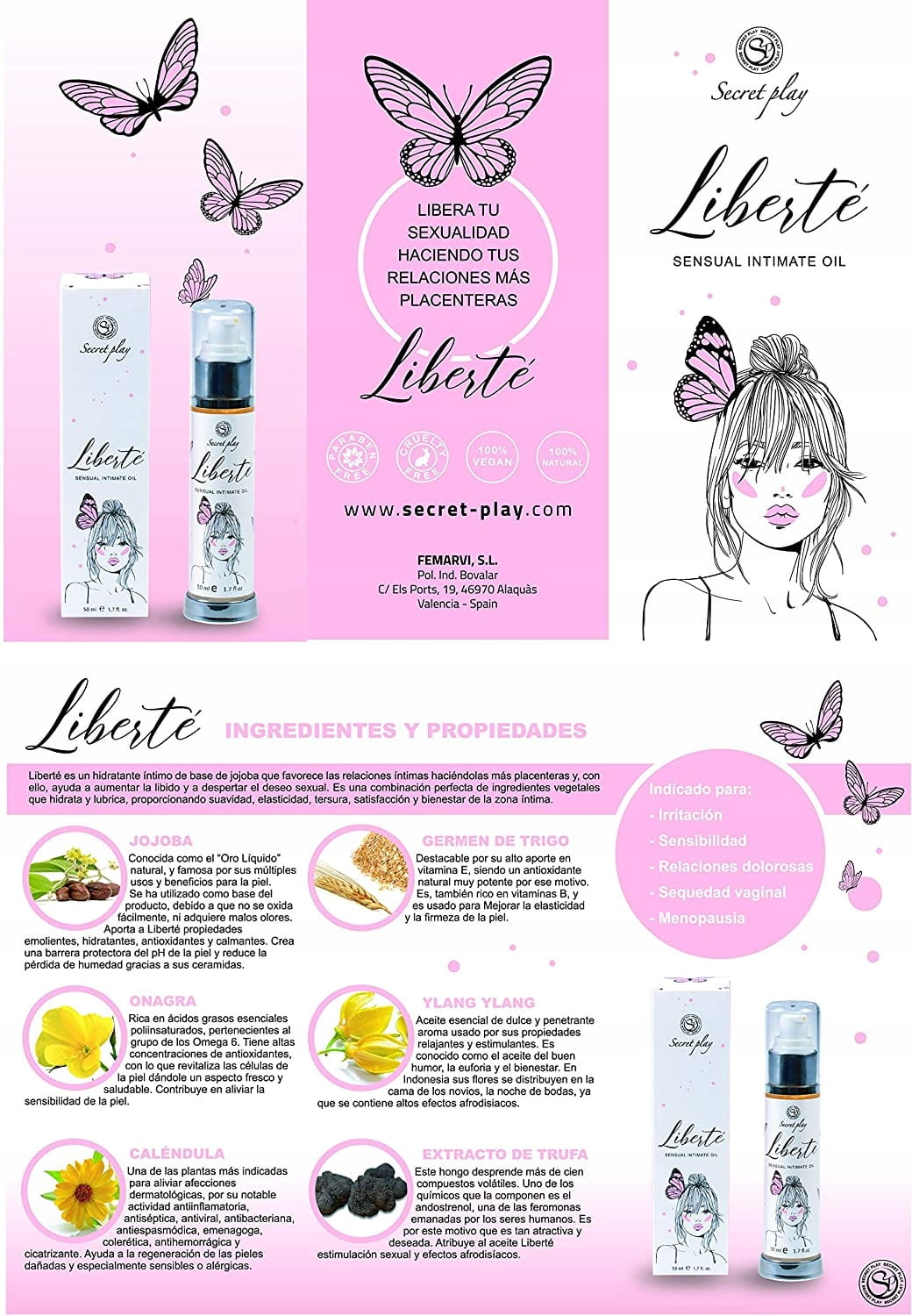 OLEJEK STYMULUJĄCY DLA KOBIET LIBERTÉ INTIMATE OIL 50 MLLiberté to intymny olejek nawilżający, który pomaga przywrócić Ci Twoje libido - przyczynia się do poprawy popędu seksualnego i intymnych relacji, czyniąc je przyjemniejszymi. Znajdziesz w nim doskonałe połączenie składników roślinnych ( Jojoba, Wiesiołka, Nagietka, Kiełków pszenicy, witaminy E ) oraz olejku eterycznego kwiatów Ylang Ylang, który swoim afrodyzjakalnym aromatem działa jak naturalny dezodorant. Taki skład olejku powoduje odpowiednie nawilżenie i natłuszczenie okolic intymnych, a co za tym idzie zapewniając im odpowiednią miękkość, elastyczność, gładkość, a Twoją satysfakcję i dobre samopoczucie. Odpowiedni dla wegan i w 100% naturalny ! Składniki aktywne :