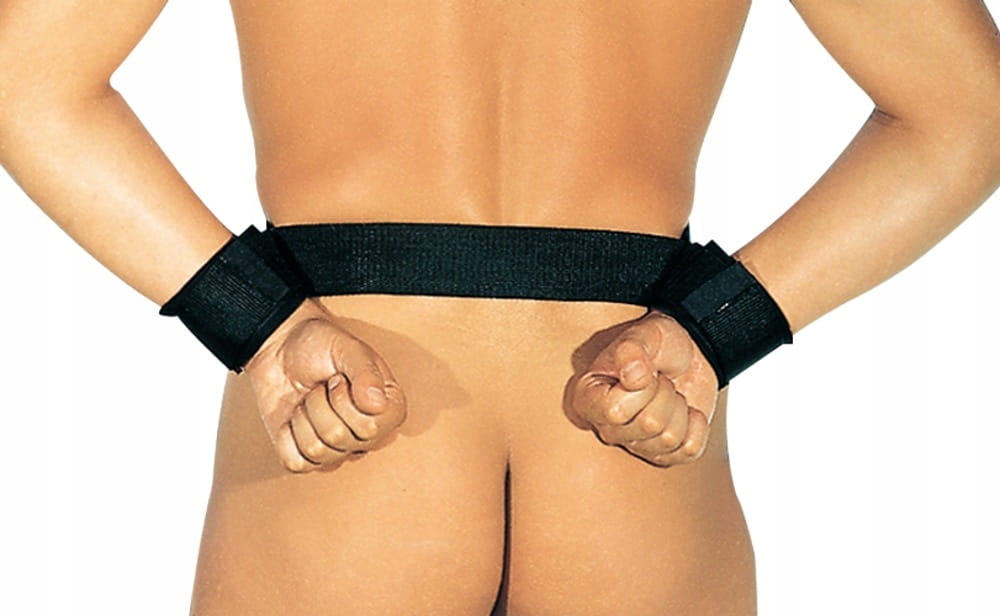 ,,Pas pokory" zakładany na talię z przyczepionymi kajdankami w formie mankietów pozwala skrępować ręce Twojego partnera na jego plecach.