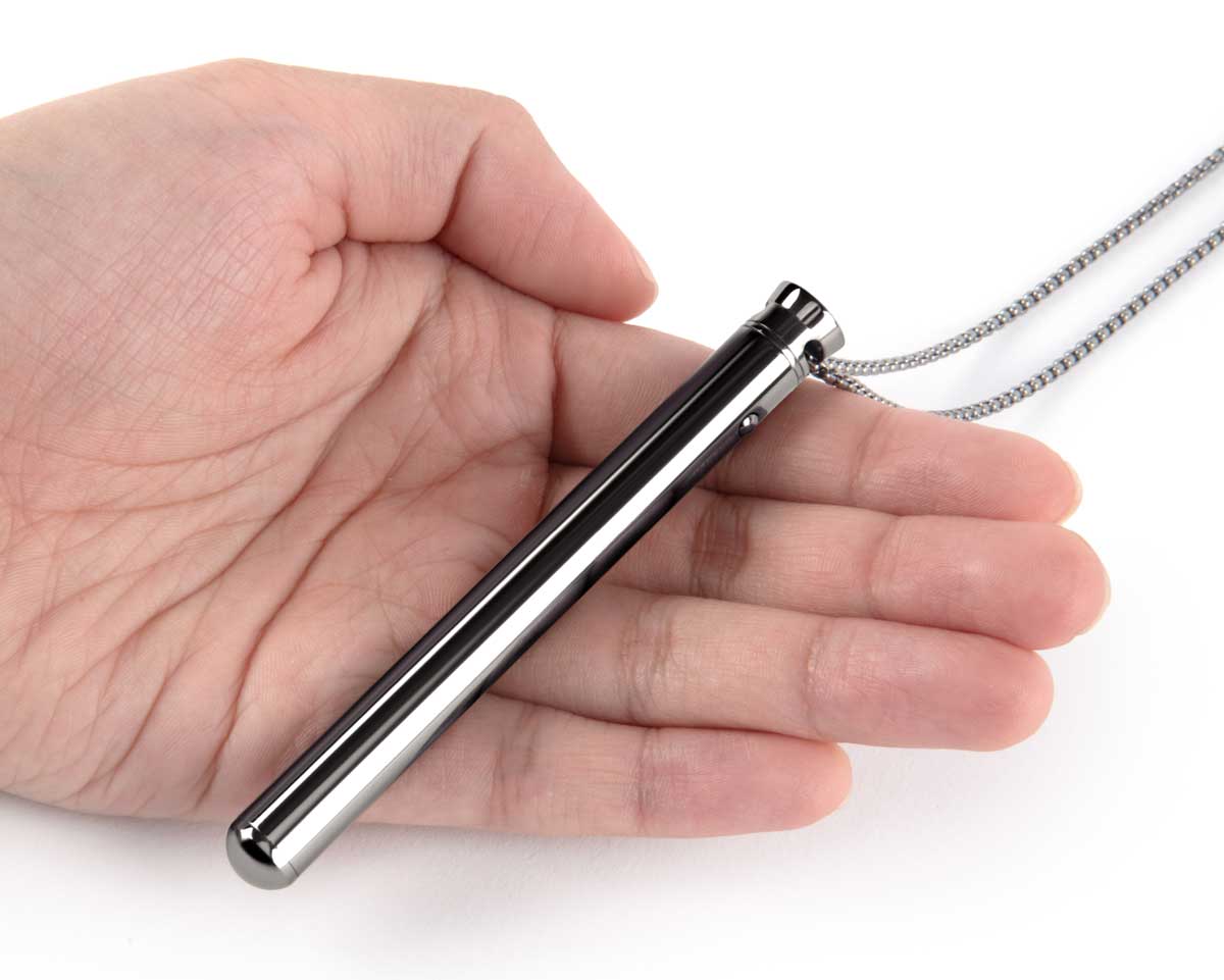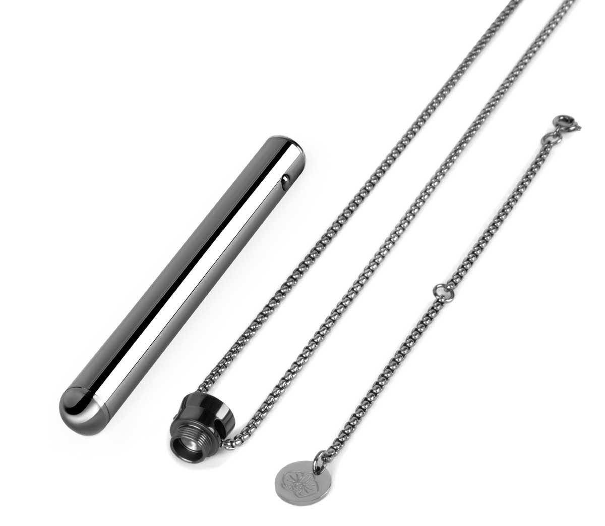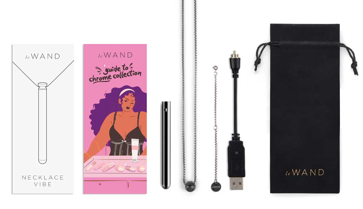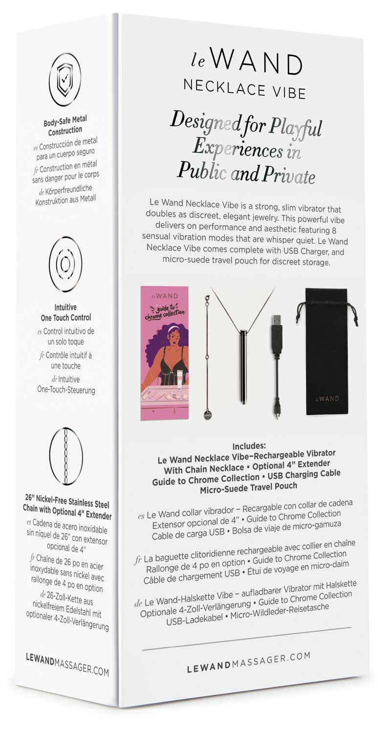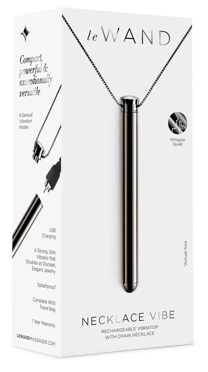 WIBRATOR NASZYJNIK LE WAND NECKLACE BLACK Naszyjnik Le Wand Vibe to kompaktowy, dyskretny wibrator zapewniająca stylową przyjemność w podróży. Wibrator ma 8 trybów wibracji i super cichy silnik, aby zadowolić Cię w dowolnym miejscu i w dowolny sposób. To mocny, smukły wibrator, który może służyć również jako atrakcyjna, elegancka biżuteria. Jest dostarczany w komplecie z ładowarką USB i etui podróżnym z mikrozamszu do dyskretnego przechowywania. Wibrator z 66 cm łańcuszkiem i opcjonalną, 10 cm przedłużką. Materiał: stal nierdzewna Wymiary: