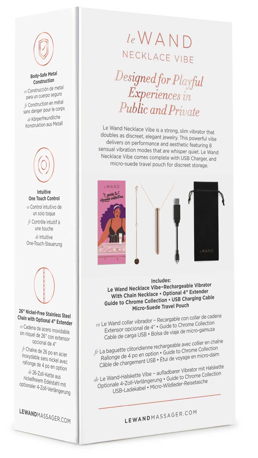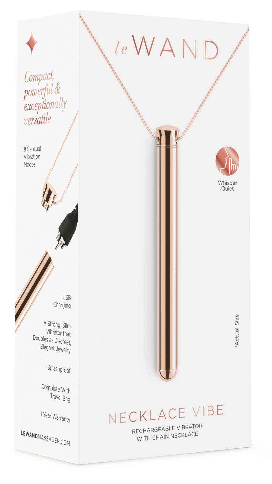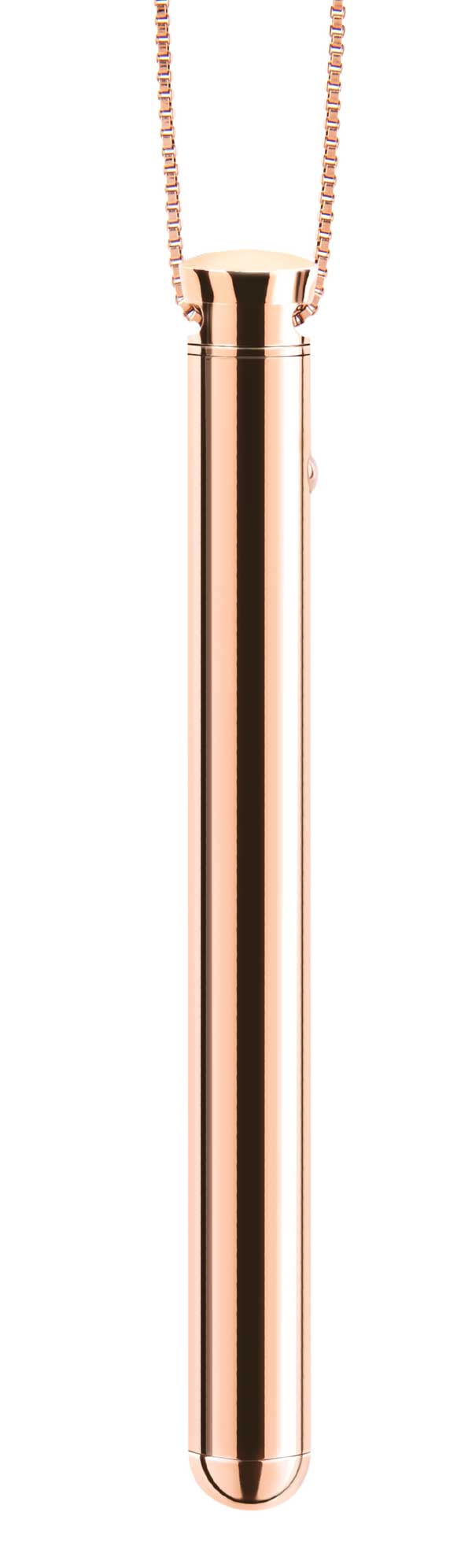 WIBRATOR NASZYJNIK LE WAND NECKLACE ROSE GOLD Naszyjnik Le Wand Vibe to kompaktowy, dyskretny wibrator zapewniająca stylową przyjemność w podróży. Wibrator ma 8 trybów wibracji i super cichy silnik, aby zadowolić Cię w dowolnym miejscu i w dowolny sposób. To mocny, smukły wibrator, który może służyć również jako atrakcyjna, elegancka biżuteria. Jest dostarczany w komplecie z ładowarką USB i etui podróżnym z mikrozamszu do dyskretnego przechowywania. Wibrator z 66 cm łańcuszkiem i opcjonalną, 10 cm przedłużką. Materiał: stal nierdzewna Wymiary: