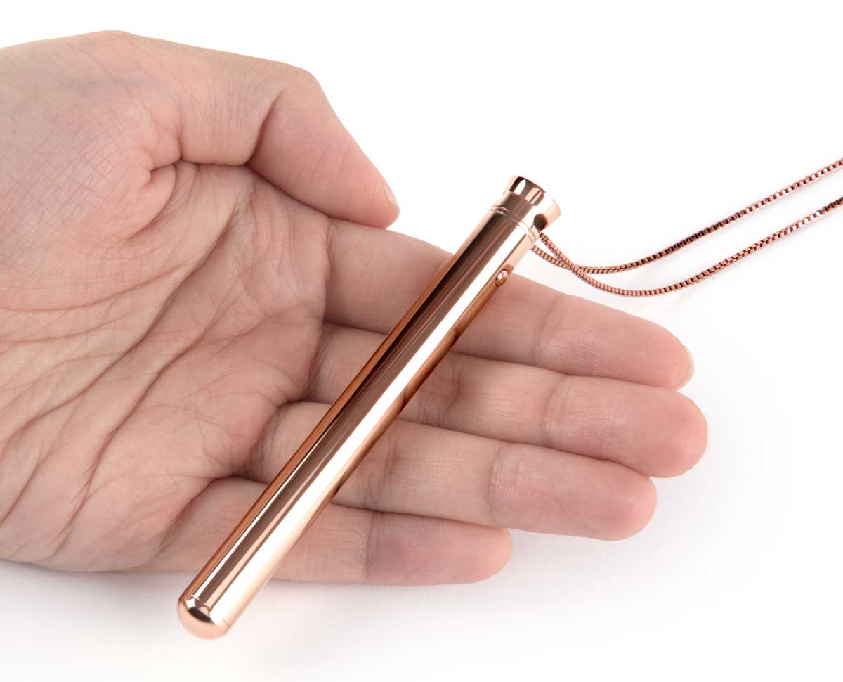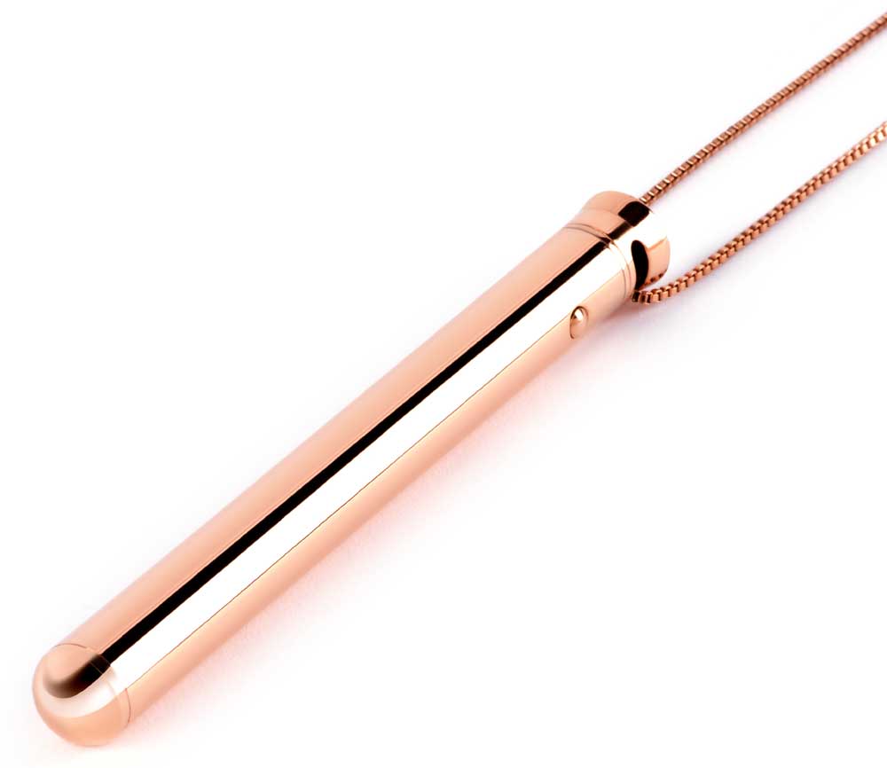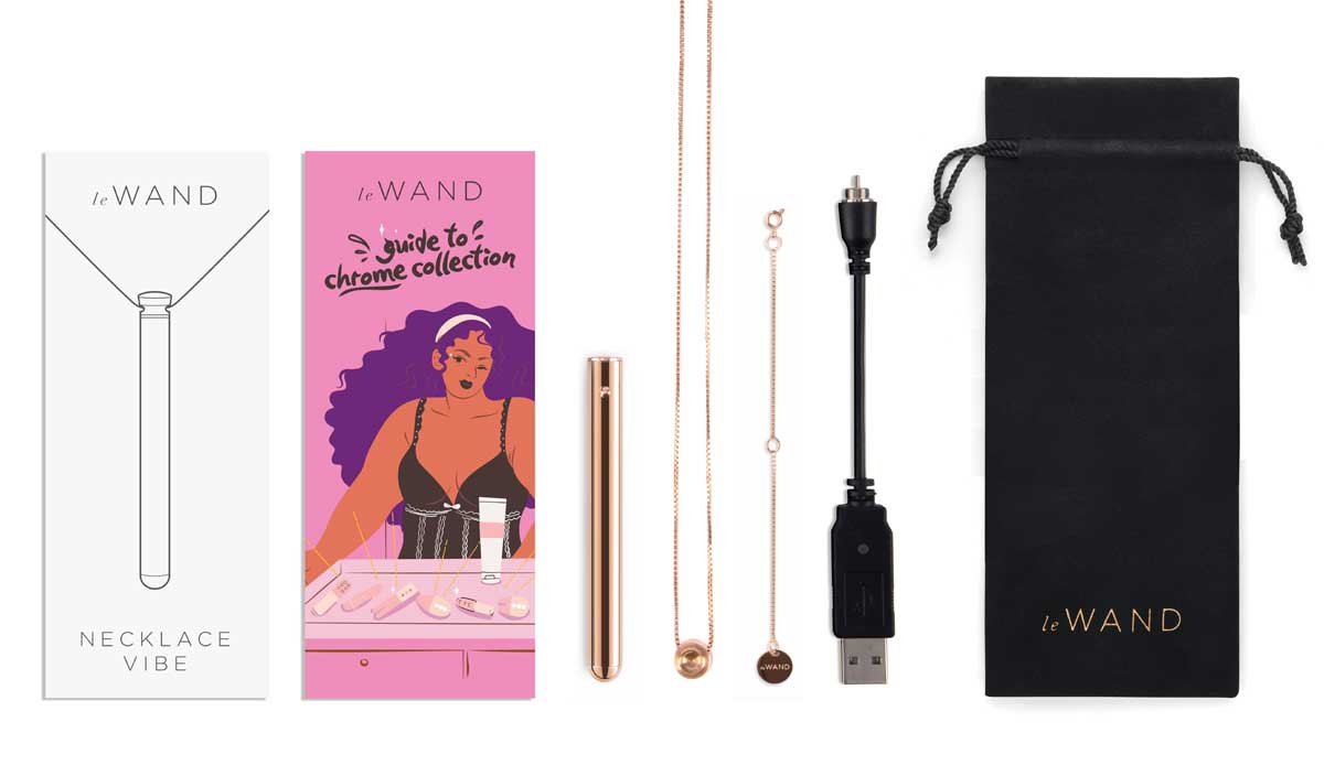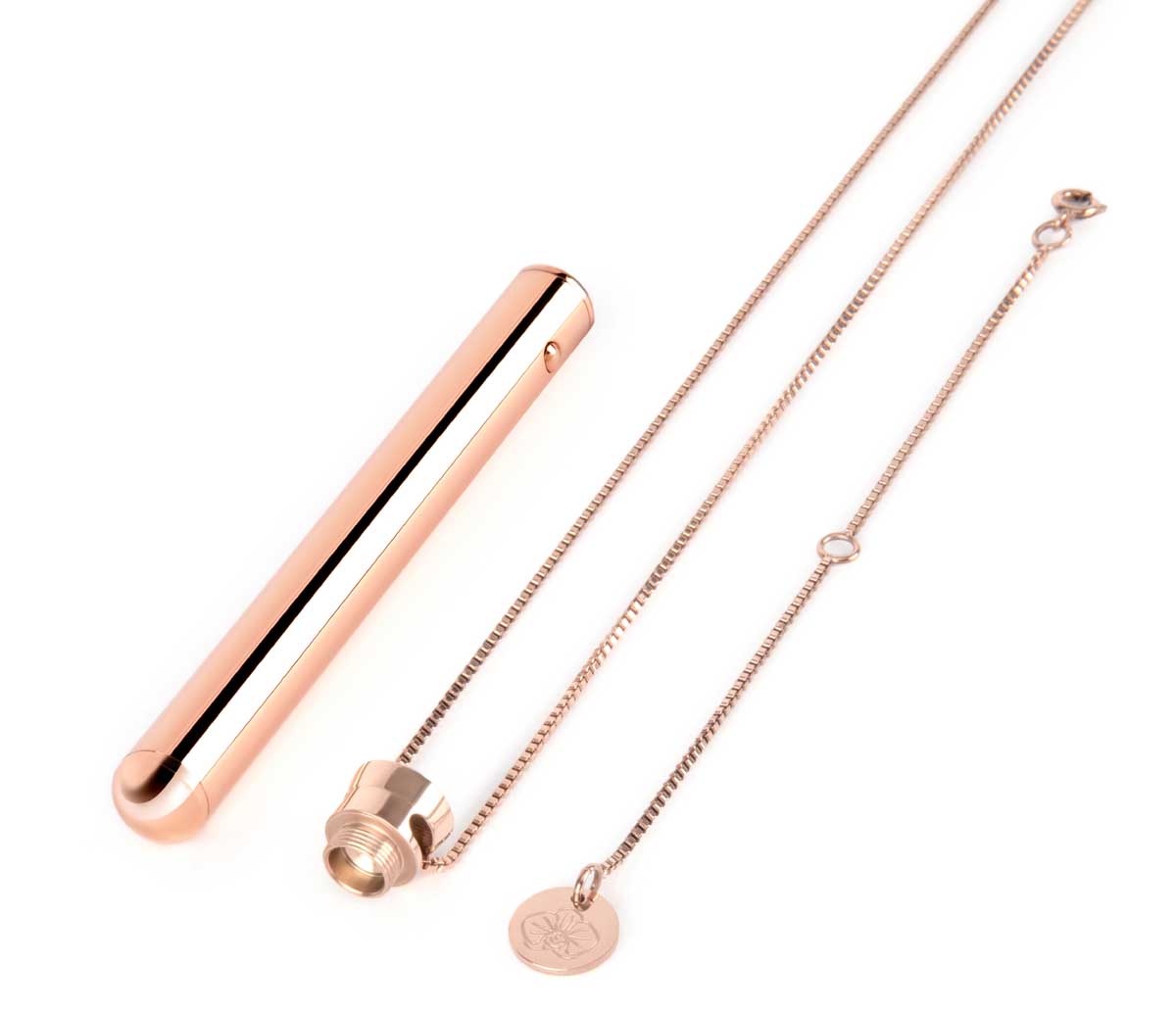 WIBRATOR NASZYJNIK LE WAND NECKLACE ROSE GOLD Naszyjnik Le Wand Vibe to kompaktowy, dyskretny wibrator zapewniająca stylową przyjemność w podróży. Wibrator ma 8 trybów wibracji i super cichy silnik, aby zadowolić Cię w dowolnym miejscu i w dowolny sposób. To mocny, smukły wibrator, który może służyć również jako atrakcyjna, elegancka biżuteria. Jest dostarczany w komplecie z ładowarką USB i etui podróżnym z mikrozamszu do dyskretnego przechowywania. Wibrator z 66 cm łańcuszkiem i opcjonalną, 10 cm przedłużką. Materiał: stal nierdzewna Wymiary: