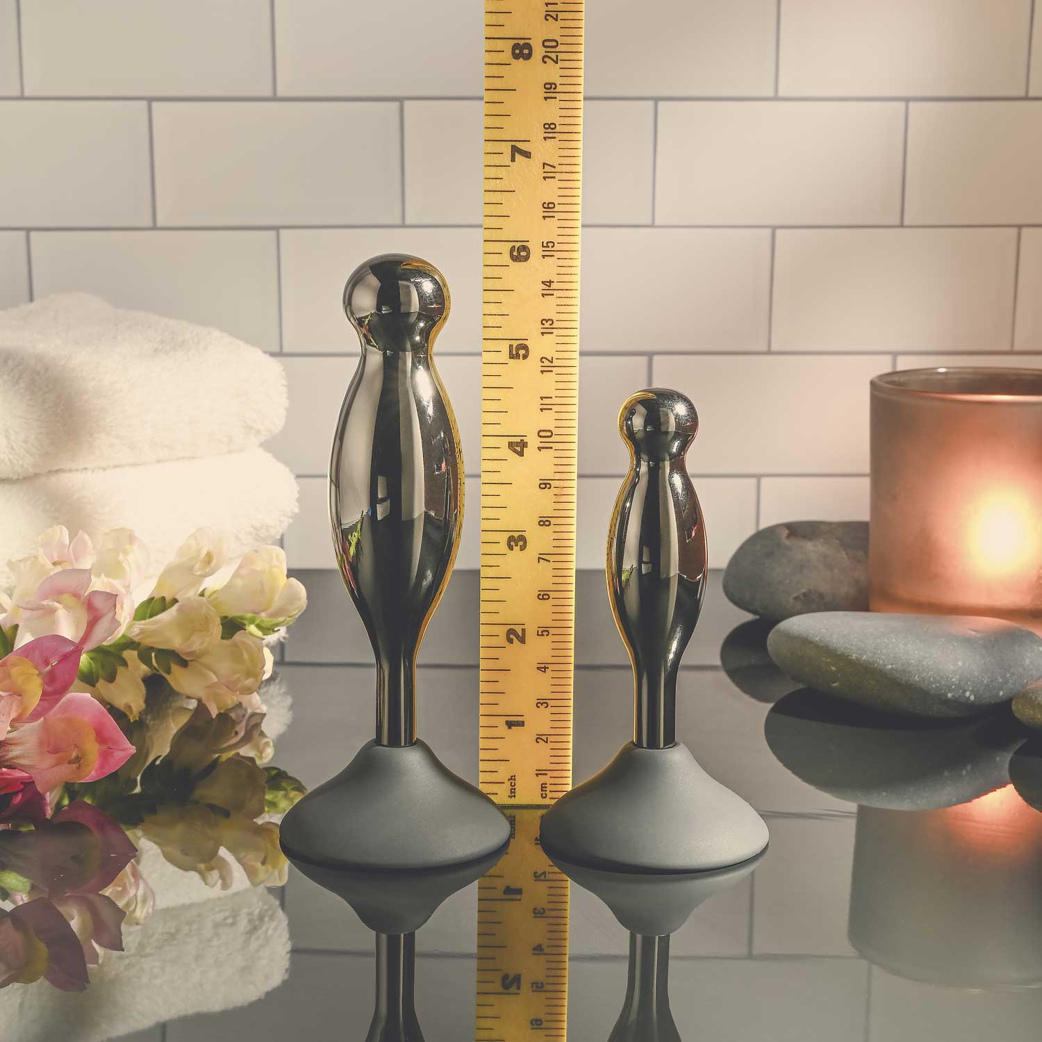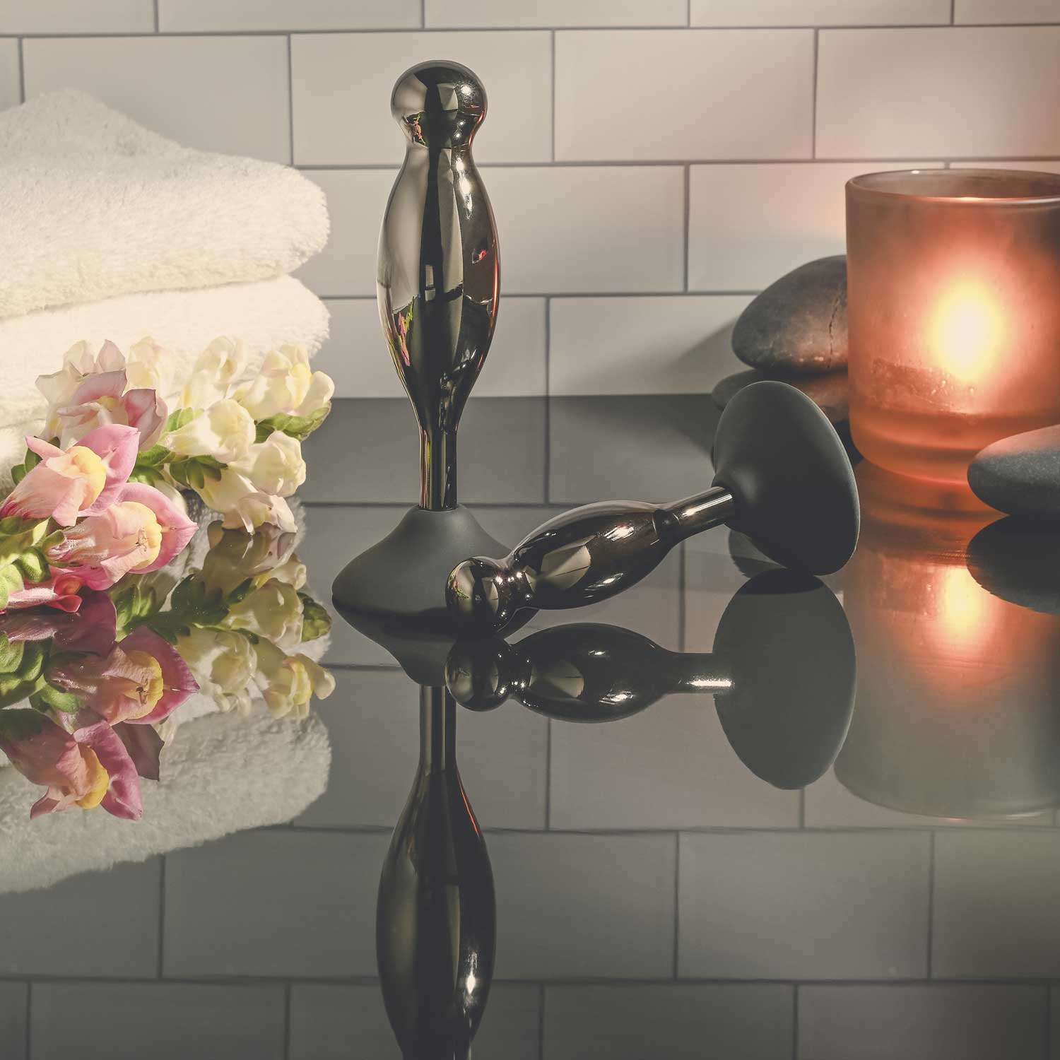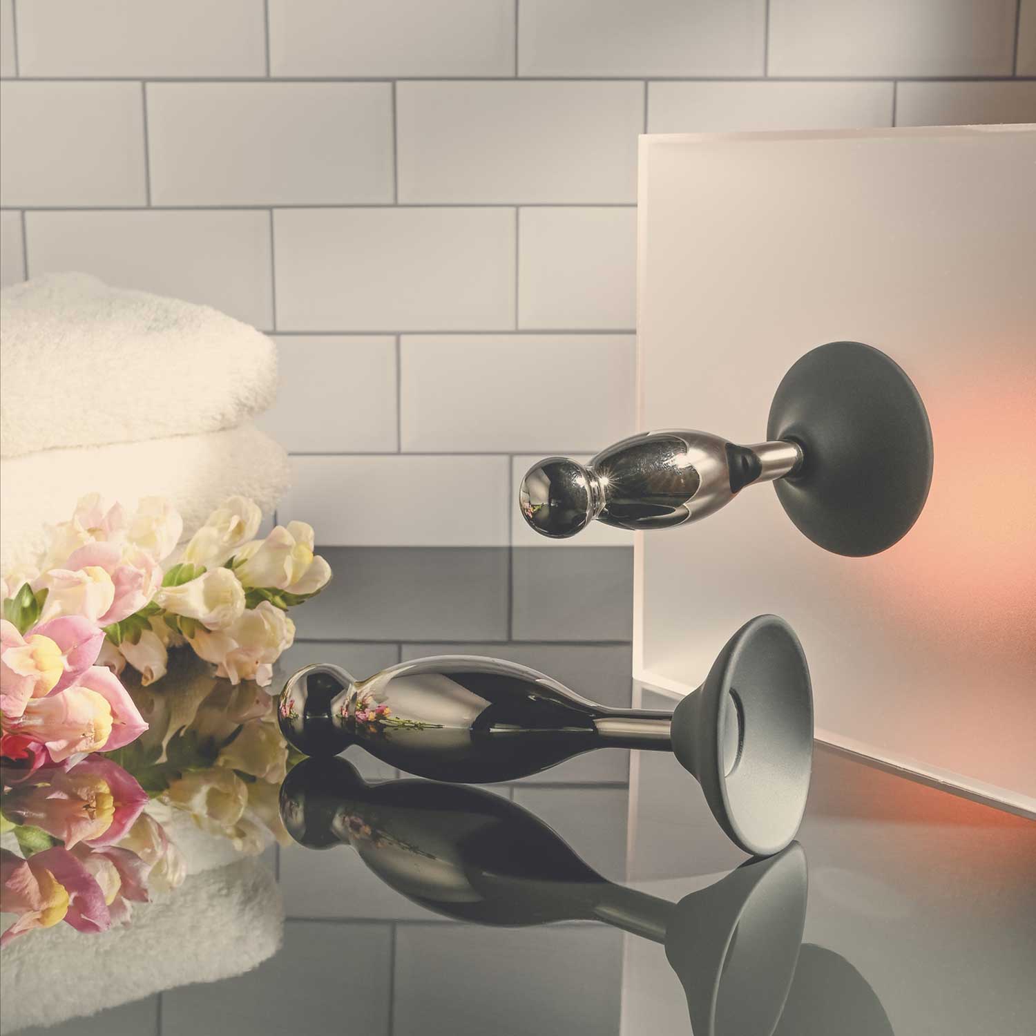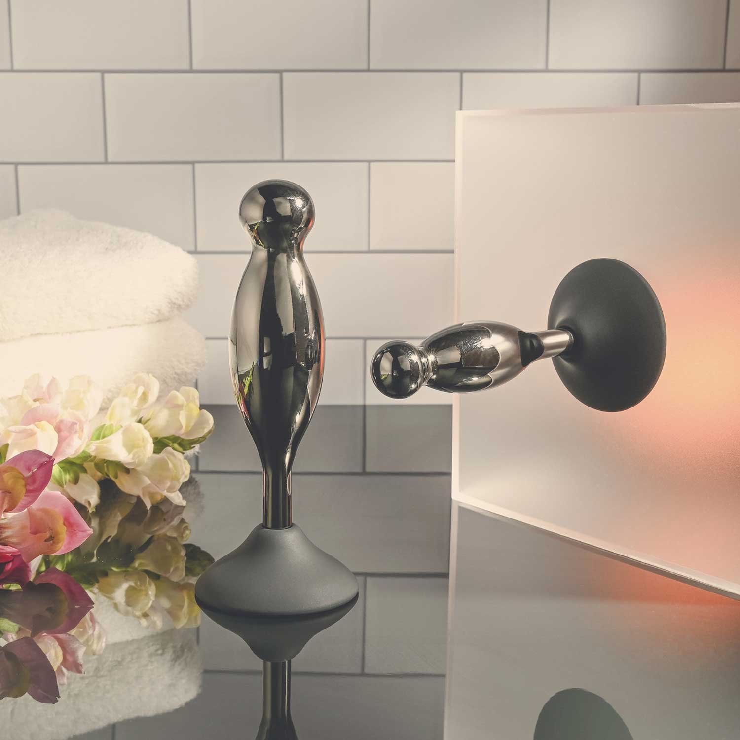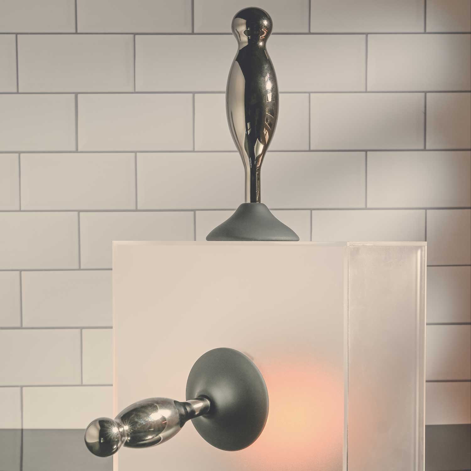 Każda silikonowa podstawa mocno przylega do każdej czystej powierzchni, podczas gdy korek z chromowanego stopu aluminium kołysze się i kręci w miejscu, gdzie najbardziej tego pragniesz!