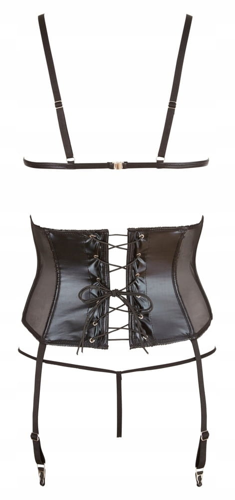 3-częściowy komplet niezwykle podniecającej bielizny z błyszczącego materiału typu wetlook.