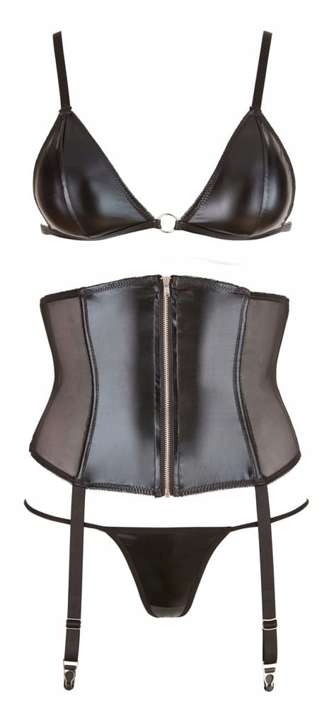 3-częściowy komplet niezwykle podniecającej bielizny z błyszczącego materiału typu wetlook.
