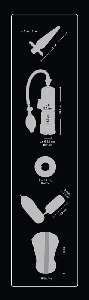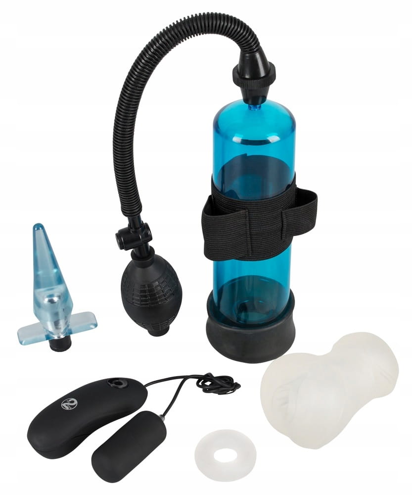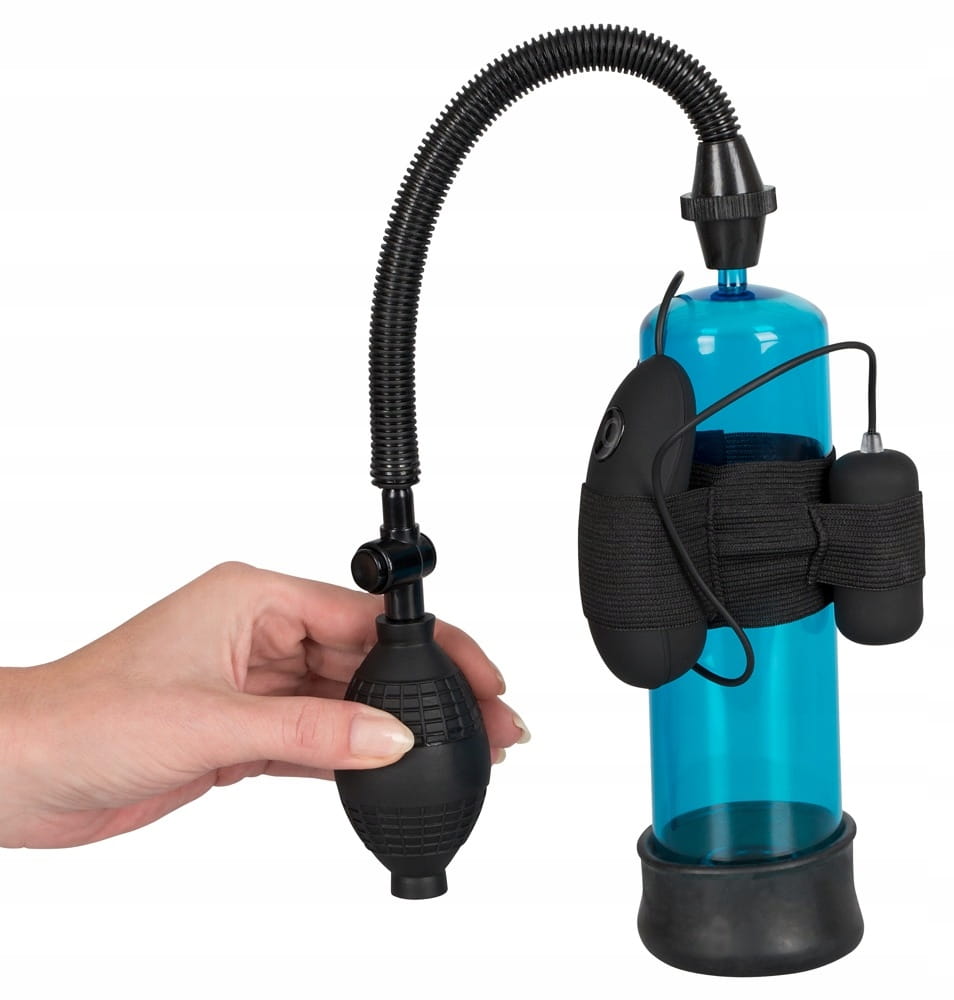- przezroczysta niebieska pompka do penisa z wyjmowanym mini wibratorem sterowanym zdalnie za pomocą dołączonego pilota. Wibrator posiada 7 trybów wibracji ( sterowane jednym przyciskiem ). Pełna długość pompki 20 cm, głębokość 19 cm, Ø cylindra 5,7 cm, długość rurki łączącej 24 cm, długość mini wibratora 5,5 cm