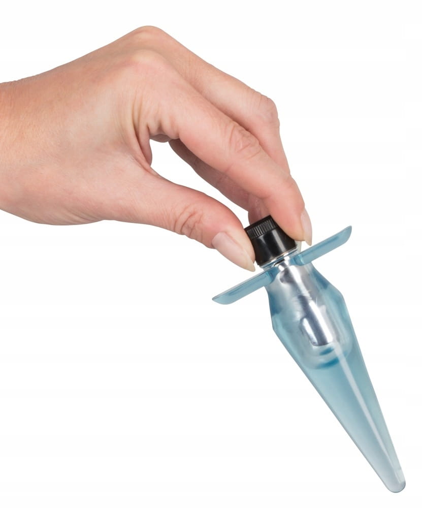 - przezroczysty, niebieski korek analny z wibracjami ( długość całkowita 11,7 cm, głębokość penetracji 9,5 cm, Ø maks. 3 cm )