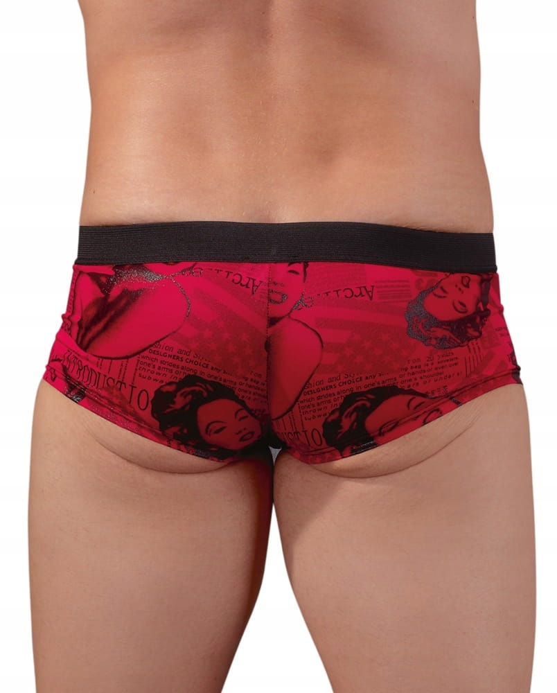 Ozdobione ciekawymi nadrukami, wykonane z elastycznej tkaniny w żywym, czerwonym kolorze.