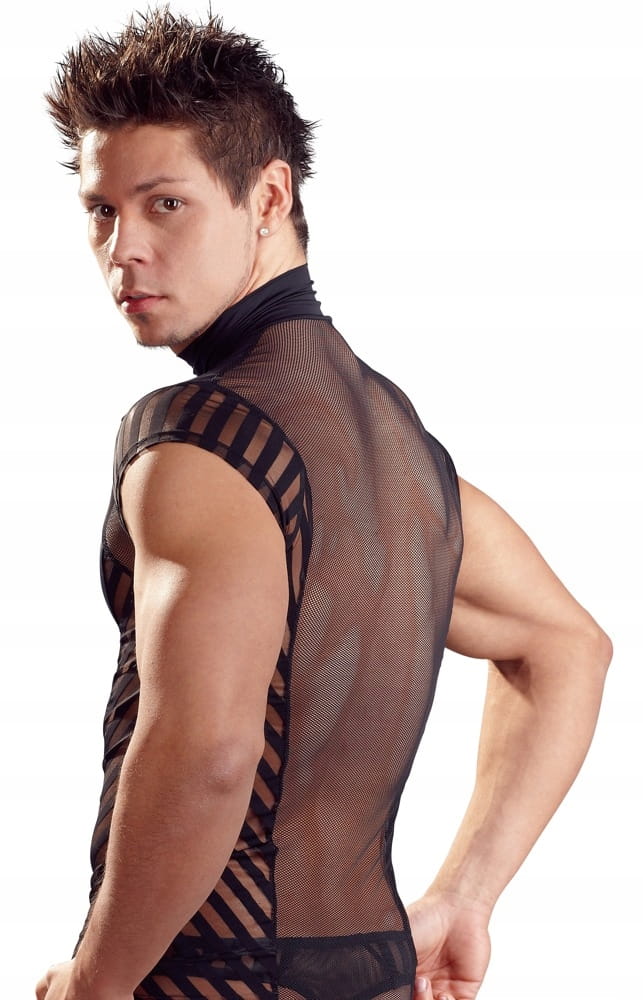 Czarna koszulka męska z prześwitującymi elementami oraz krótkimi rękawami