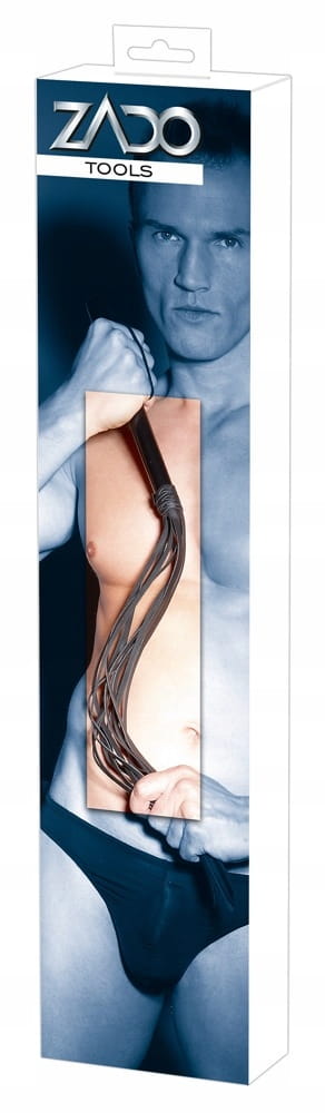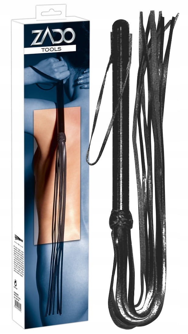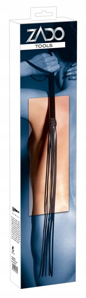 Wysokiej klasy czarny pejcz wykonany z miękkich, skórzanych rzemieni przymocowanych do czarnej, drewnianej rączki.