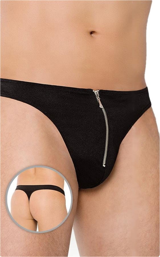 Stringi męskie z elastycznej dzianiny z przodu, przez całą długość zamek błyskawiczny. Cały tył wykonany z tej samej dzianiny