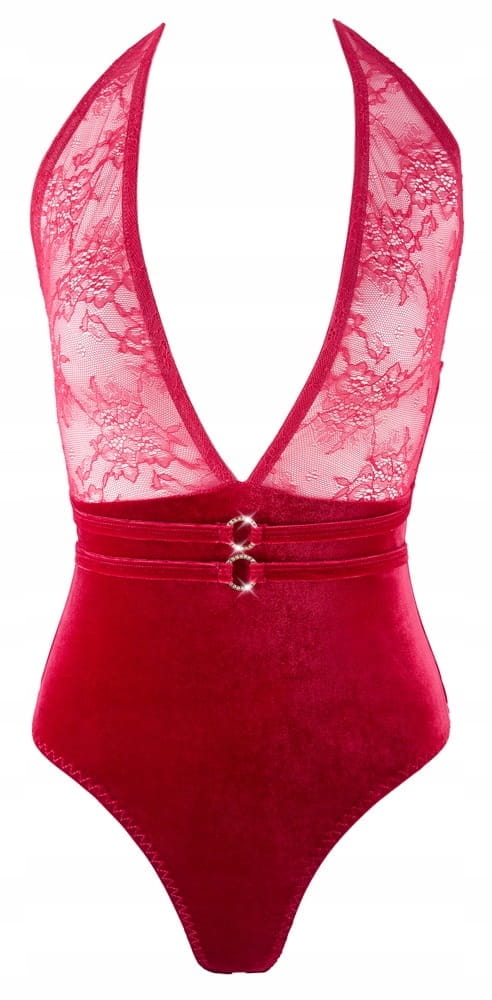 Przytulnie miękki aksamit i delikatna koronka ! Aksamitne body w miłosnej i podniecającej czerwieni z koronkową górą. Przód bielizny w okolicy talii ozdobiony jest aksamitnymi paseczkami i małymi, biżuteryjnymi akcentami - metalowe kółeczka w kolorze złota pokryte drobnymi, błyszczącymi kryształkami. Tył to głęboko wycięte i ekscytujące plecy. Przytulnie miękki i elastyczny materiał jest nie tylko kuszący dla oka, ale także niezwykle wygodny w noszeniu. Delikatna koronkowa góra, niczym mgiełka unosi do góry i podkreśla krągłość Twoich piersi. Zapięcie w kroku i na szyi na zatrzaski jest bardzo praktyczne - można je jak najszybciej rozpiąć, jeśli zajdzie taka potrzeba... Zalecamy delikatne pranie ręczne bielizny z łagodnym detergentem.