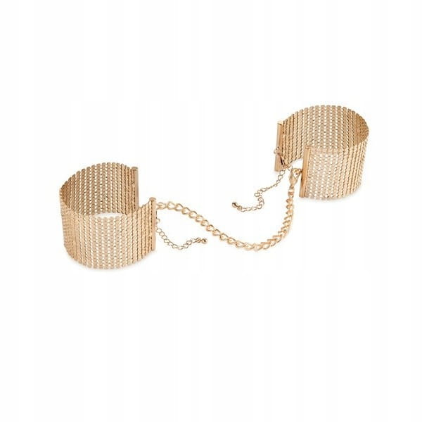 Bijoux Indiscrets Gold metallic mesh handcuffs to stylowe złote kajdanki połączone łańcuszkiem.