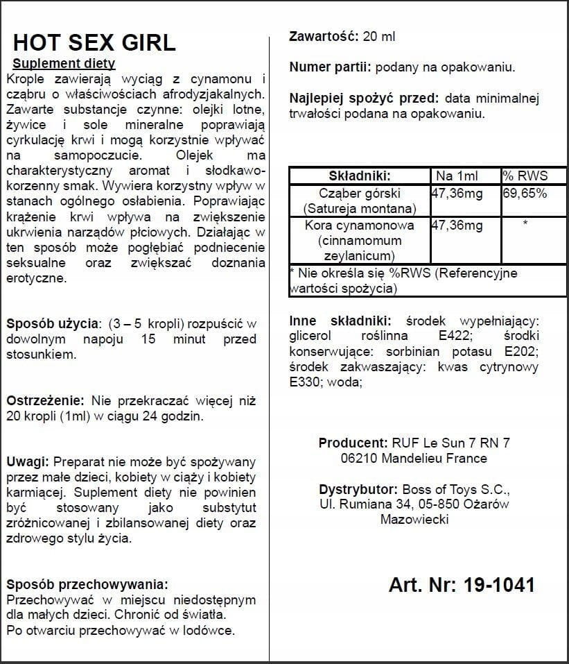 HOT SEX GIRL to krople dla kobiet działające stymulująco i pobudzająco na organizm i zwiększające ochotę na seks. Preparat potęguje doznania seksualne oraz przyśpiesza osiągnięcie orgazmu. Może także zwiększać ochotę na seks, oraz nasilać pożądanie. Swoje działanie zawdzięcza znanym naturalnym afrodyzjakom : kory cynamonowca oraz liścia cząbru. Cząber już od czasów starożytnych uważany był jako silny i naturalny afrodyzjak. Jest bogatym źródłem witamin i minerałów. Zawiera m.in. żelazo, potas, cynk i witaminę C. Kora cynamonowca działa podobnie jak Żeń-szeń, usuwając zmęczenie, pobudzając cyrkulację krwi także w narządach płciowych u kobiet i dodając sił witalnych. Już sam zapach olejku eterycznego pobudza zmysły i może pogłębiać podniecenie seksualne, oraz zwiększać doznania erotyczne. Wystarczy dodać kilka kropel do napoju, żeby przyspieszyć krążenie krwi i spowodować lepsze ukrwienie, a przez to większą wrażliwość narządów płciowych na bodźce. Środek w 100 % bezpieczny dla zdrowia i bez skutków ubocznych. Może być łączony z różnymi napojami nie zmieniając ich smaku. Sposób użycia : wymieszać od 3 do 5 kropli z napojem, lub wlać pod język 30 minut przed stosunkiem. (1 kropla = 0,5 ml). Nie przekraczać dawki 20 kropli dziennie. Uważaj przy dodawaniu go do kawy lub herbaty, gdyż wysoka temperatura może osłabić działanie.