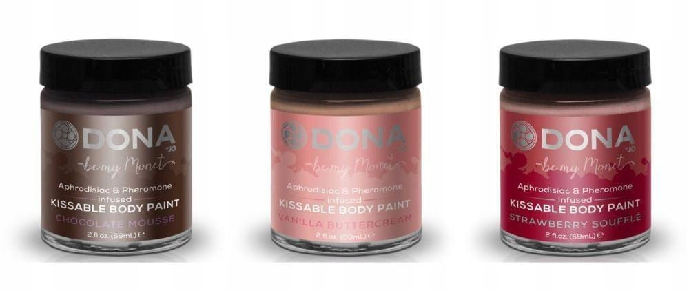 Dona - jadalna czekolada do ciała zawierająca także dodatek feromonów i afrodyzjaków. Przeznaczona do malowania na skórze wzorów oraz ich smakowania, lizania i całowania. Dostępna w trzech wersjach smakowych inspirowanych słodkimi deserami - truskawkowy suflet.