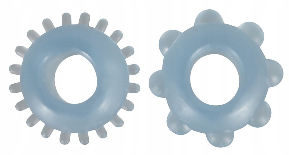 Dwa przezroczyste niebieskie pierścienie na penisa o różnej wielkości wypustek.