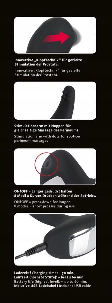 Punktem najważniejszym jest mała kulka w końcówce korka, która wyposażona jest w innowacyjną technikę pukania. Będzie ona stymulować bardzo erogenną strefę u mężczyzn, dzięki czemu czekają go przeżycia niezwykle intensywnych orgazmów !