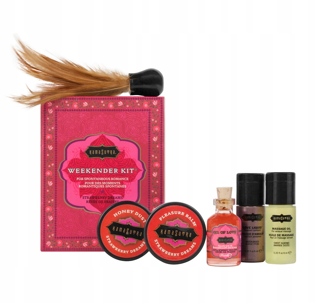 Zestaw na niezapomniany weekend erotycznych kosmetyków - Kama Sutra Weekender Kit Strawberry Dreams. Macie w planach weekend we dwoje ? Wypełniony pieszczotami, całowaniem się, przytulaniem i kochaniem się ? Postarajcie się więc, by był on jak najbardziej bogaty i urozmaicony przyjemnościami, jakie daje bliskość dwojga osób. Ten truskawkowy zestaw pozwoli rozpalić ciała i zmysły, wprowadzić nowe smaki i zapachy w pieszczotach i seksie. Zestaw składa się z :