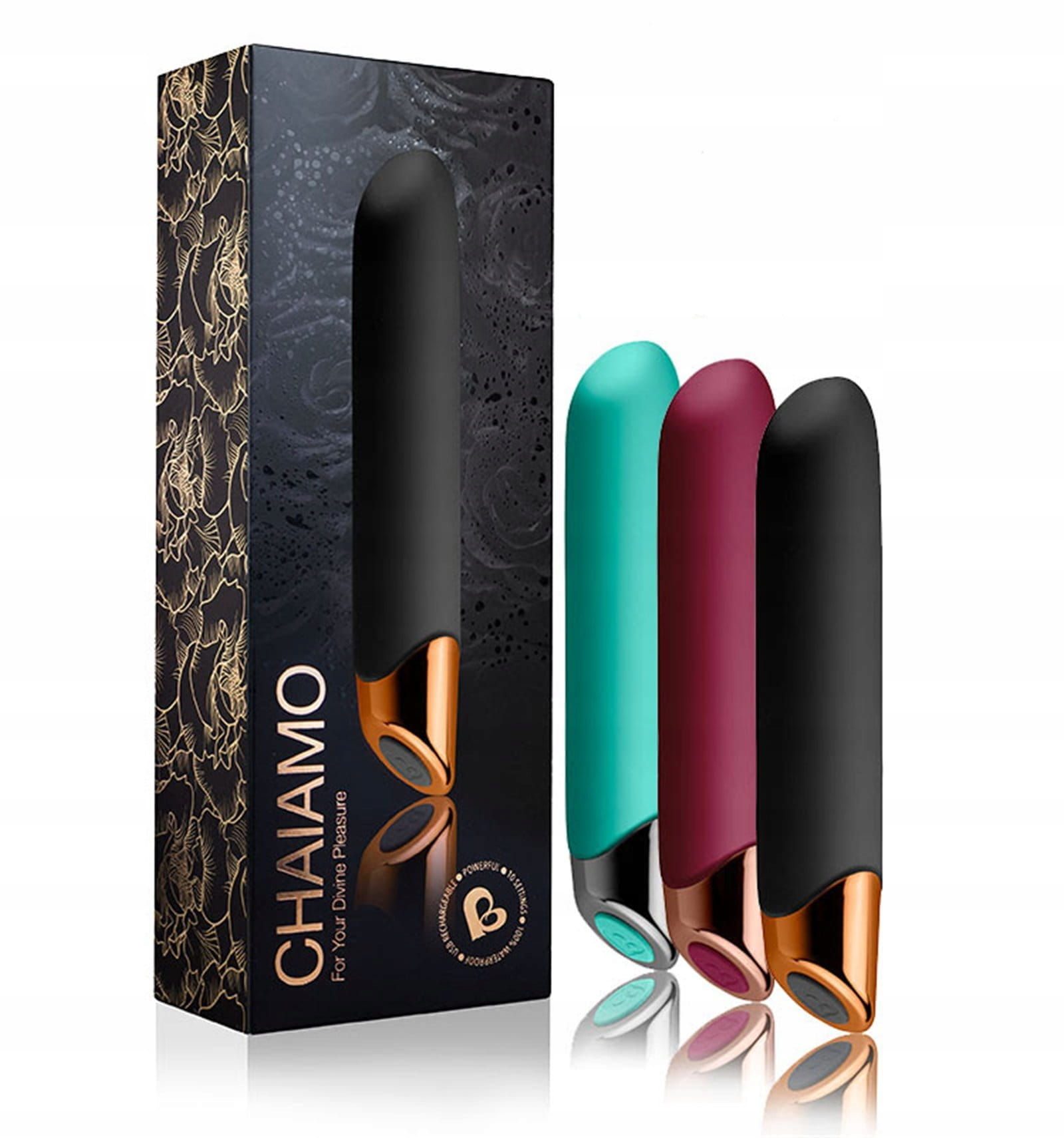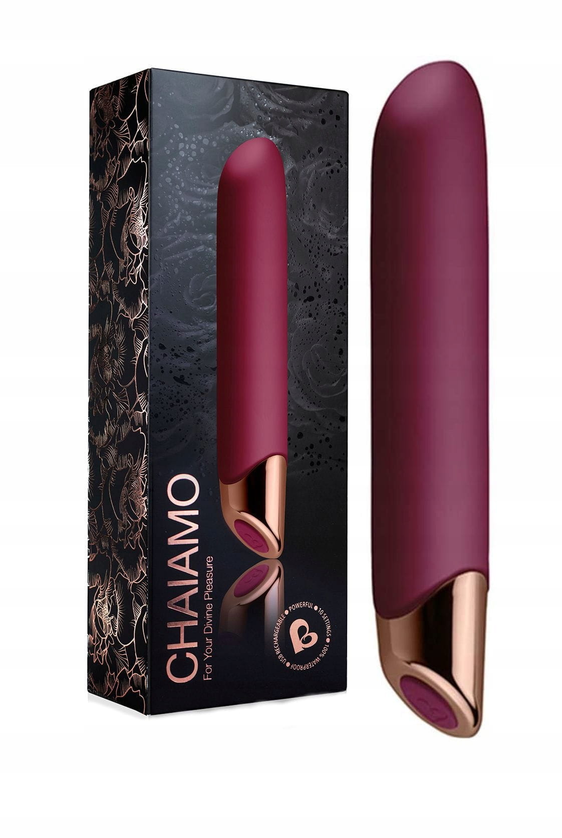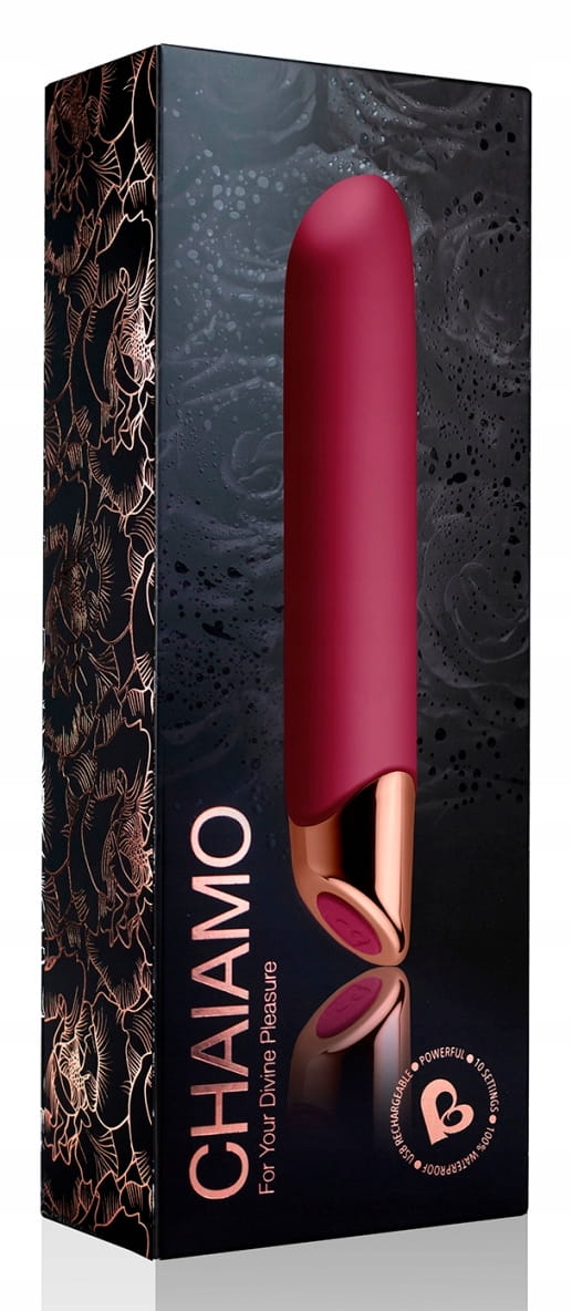 Dla twojej Boskiej przyjemności ! Piękny w swej prostocie i szalenie elegancki wibrator stworzony z myślą o zapewnieniu zadziwiających orgazmów, raz za razem, nawet tym kobietom, które uskarżają się na małą wrażliwość stref intymnych na bodźce. Dzięki 10 bardzo wydajnym i silnym rodzajom wibracji, które mogą Cię pieścić nawet do 3 godzin ( ! ), będziesz miała duże trudności z odłożeniem zabawy z CHAIAMO na później. Najwyższej jakości, aksamitny i jedwabiście miękki w dotyku silikon typu platynowego pokrywa wibrator aż do platerowanej końcówki. Panel sterowania to tylko jeden przycisk służący do włączenia i wyłączenia gadżetu, oraz do zmiany rodzaju wibracji. Wibrator łatwo wkłada się do pochwy dzięki miękkiej i śliskiej powierzchni silikonu. Po włożeniu wibratora ustaw żądaną intensywność wibracji na panelu sterowania. Dostępnych jest 10 różnych i bardzo silnych trybów wibracji, a stożkowa końcówka została znakomicie zaprojektowana, aby doprowadzić Cię do ostatecznego punktu kulminacyjnego. CHAIAMO wysyła zmysłowe, silne i głębokie wibracje po całym ciele, jednocześnie intensywnie stymulując Twoje strefy przyjemności. Przygotuj się na przeżycie swojego niezapomnianego orgazmu ! Zawsze używaj lubrykantów na bazie wody dla dodatkowego poślizgu. Środki na bazie silikonu mogą bezpowrotnie uszkodzić delikatną powłokę silikonu. Do czyszczenia używaj letniej, bieżącej wody i łagodnego mydła. Aby zachować szczególną ostrożność, zalecamy specjalne środki odkażające typu Toy-cleaner. CHAIAMO jest także wodoodporny - nie musisz rezygnować z ekscytującej przyjemności podczas kąpieli.