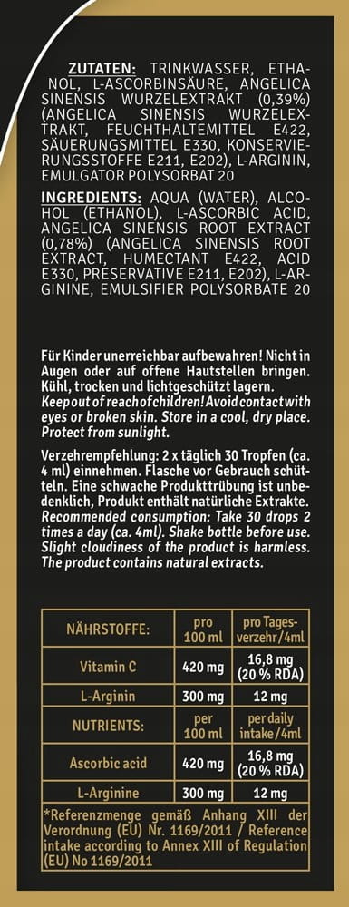 Zawarta w kroplach L-arginina wraz z witaminą C wzmacnia organizm, działa pobudzająco, zwiększa energię seksualną oraz odczuwanie większej rozkoszy, polepsza życie seksualne oraz przedłuża aktywność seksualną. L-arginina to aminokwas, który oprócz budowy białka bierze udział w wielu procesach metabolicznych. Wspomaga tworzenie kolagenu oraz gojenie się ran. Pobudza uwalnianie hormonów. Jest przekaźnikiem nerwowym w centralnym układzie nerwowym. L-arginina towarzyszy pierwszemu stadium przy reakcji chemicznej tlenku azotu : reguluje napięcie naczyń krwionośnych i je rozszerza ułatwiając tym samym przepływ krwi.