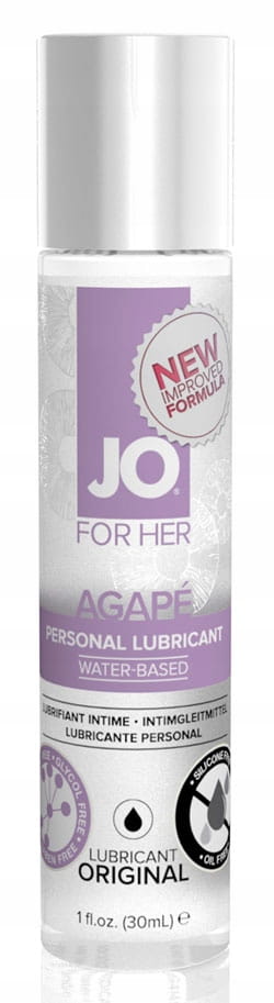 LUBRYKANT WODNY DLA KOBIET SYSTEM JO AGAPE 30 MLSystem JO® Agapé to lubrykant na bazie wody stworzony z myślą o potrzebach kobiet. System JO® Agapé to wysokiej jakości kosmetyk o neutralnym działaniu. Jest bezwonny i bezsmakowy. Ponieważ nie zawiera glikolu, parabenów, silikonów, olejów ani gliceryny jest bezpieczny w codziennym stosowaniu. Dzięki swojej lekkiej formule i naturalnemu składowi jest rekomendowany kobietom w czasie menopauzy, ponieważ niweluje jej objawy. Lubrykant wodny System JO® Agapé idealnie nadaje się do zapobiegania suchości pochwy oraz jest odpowiedni dla kobiet wrażliwych na glicerynę. Lubrykant ma neutralne dla pochwy pH, dzięki nie podrażnia delikatnych stref intymnych. Wodna baza sprawia, że produkt nie zostawia plam, łatwo się zmywa i nie klei się. Co więcej, można używać go z prezerwatywami i silikonowymi gadżetami erotycznymi bez obawy, że lubrykant uszkodzi ich powierzchnię. Lubrykant produkowany w USA zgodnie z surowymi normami FDA dotyczącymi bezpieczeństwa. Zalety: