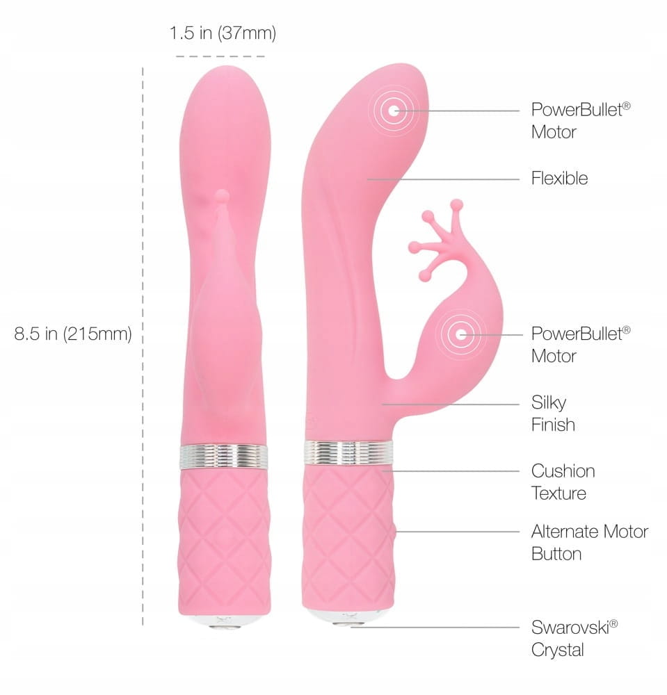 Idealnie wszechstronny ! Luksusowy wibrator „Pillow Talk Kinky” do jednoczesnej i precyzyjnej stymulacji punktu G i łechtaczki z miękką czteroramienną koroną zakończony efektownym kryształem Swarovski®. Wibrator Kinky rozpieszczać Cię będzie pracą 2 silników PowerBullet®Motor i głębokimi, silnymi wibracjami o niskich częstotliwościach dla jak najlepszej stymulacji. Siła wibracji jest regulowana bezstopniowo. Jak korzystać z wibratora Pillow Talk Kinky ? Za pomocą wibratora Kinky możesz jednocześnie stymulować punkt G i łechtaczkę. Po prostu ostrożnie włóż go do pochwy. Następnie możesz włączyć wibracje za pomocą przycisku z kryształem Swarovski®. Przytrzymaj przycisk wciśnięty, aż do osiągnięcia żądanych poziomów wibracji i szybkości drgania korony na łechtaczce.