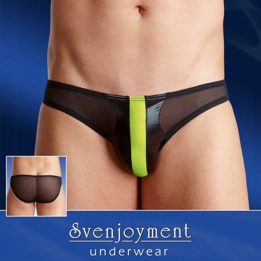 Lekko przezroczyste czarne slipy z neonowym paseczkiem.