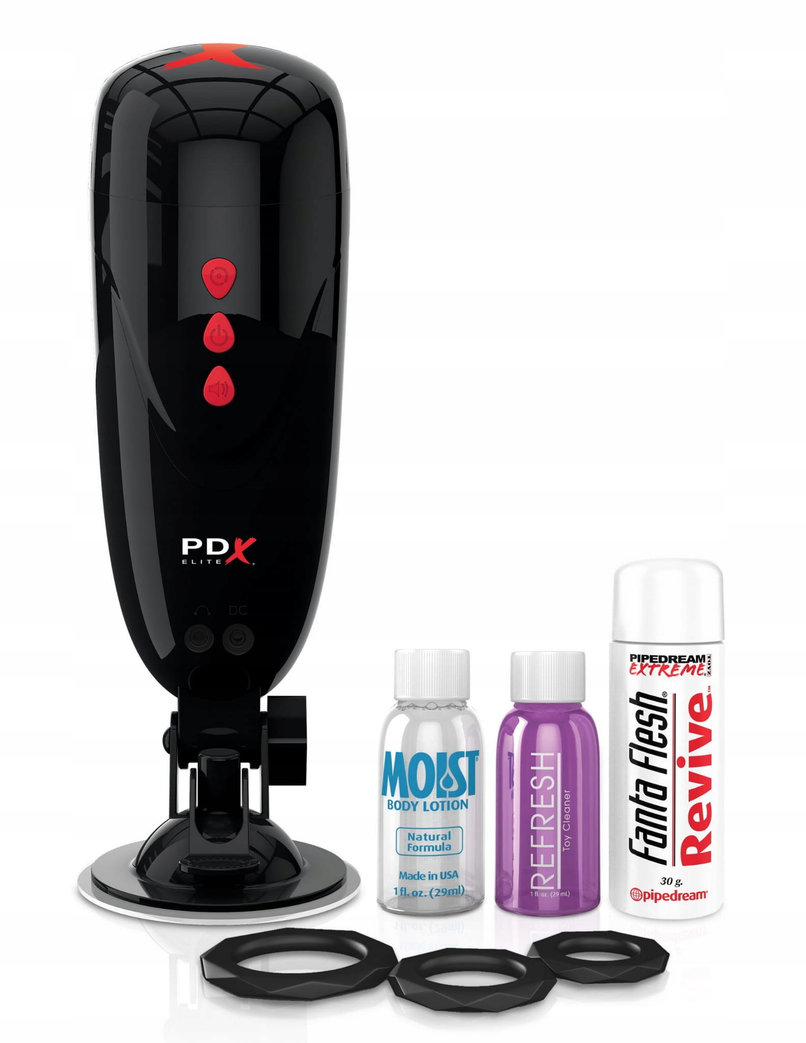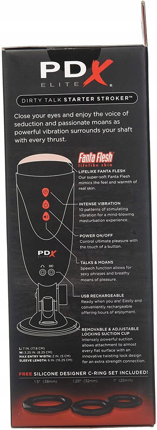WIBRUJĄCY MASTURBATOR PDX ELITE DIRTY TALK STARTER STROKER USB Gotowy na najlepszą masturbację w swoim życiu ? Oto idealny masturbator dla osób początkujących, ale i zaawansowanych użytkowników gadżetów - PDX ELITE Dirty Talk Starter Stroker, który oferuje całkowitą satysfakcję seksualną na kilku poziomach ! Silne wibracje zostały w nim połączone z kobiecymi jękami pełnymi podniecenia i sexownymi komentarzami, by maksymalnie uprzyjemnić Ci sesję i podkręcić gorącą temperaturę. Dzięki temu sesje masturbacji osiągają zupełnie nowy poziom ! Niezwykle delikatna, gładka i realistyczna w dotyku powierzchnia wnętrza masturbatora została wykonana z wysokiej jakości, opatentowanego materiału Fanta Flesh, który do złudzenia przypomina ludzką skórę. Wypełnia on wnętrze masturbatora wraz z niezliczoną ilością masujących żeberek, nierówności i wypustek. Te podniecające detale doprowadzą Cię do prawdziwego szaleństwa i eksplozji przy każdym pchnięciu. Jeśli chcesz jeszcze dodatkowej przyjemności, uruchom przycisk wibracji, a 10 unikalnych rodzajów silnych drgań powędruje wzdłuż całej powierzchni Twojego penisa. Odkryj swoje ulubione opcje ! Solidna obudowa zewnętrzna masturbatora posiada silną przyssawkę, dzięki której możesz używać gadżetu bez udziału rąk ustawiając tubę i blokując jej położenie pod żądanym kątem. Zamknij oczy i ciesz się każdą chwilą wśród namiętnych jęków i szeptów. Łatwa obsługa za pomocą 3 przycisków. Jeden odpowiada za włączenie i wyłączenie ładowanego kablem USB gadżetu. Drugi zapewnia kontrolę nad rodzajem wibracji, a trzeci uruchamia namiętne szepty, odgłosy i głos podnieconej partnerki. Czyszczenie masturbatora po zabawie jest bardzo łatwe z użyciem Refresh Toy Cleaner i ciepłej wody. Wewnętrzny wkład wykonany z cyberskóry Fanta Flesh jest wyjmowany dla łatwego czyszczenia. Aby zachować na dłużej oryginalną miękkość Fanta Flesh, nałóż po całkowitym wyschnięciu puder do pielęgnacji i regeneracji cyberskóry Fanta Flesh Revive. Masturbator zawiera dodatkowo 3 silikonowe pierścienie na penisa, każdy o innej średnicy.