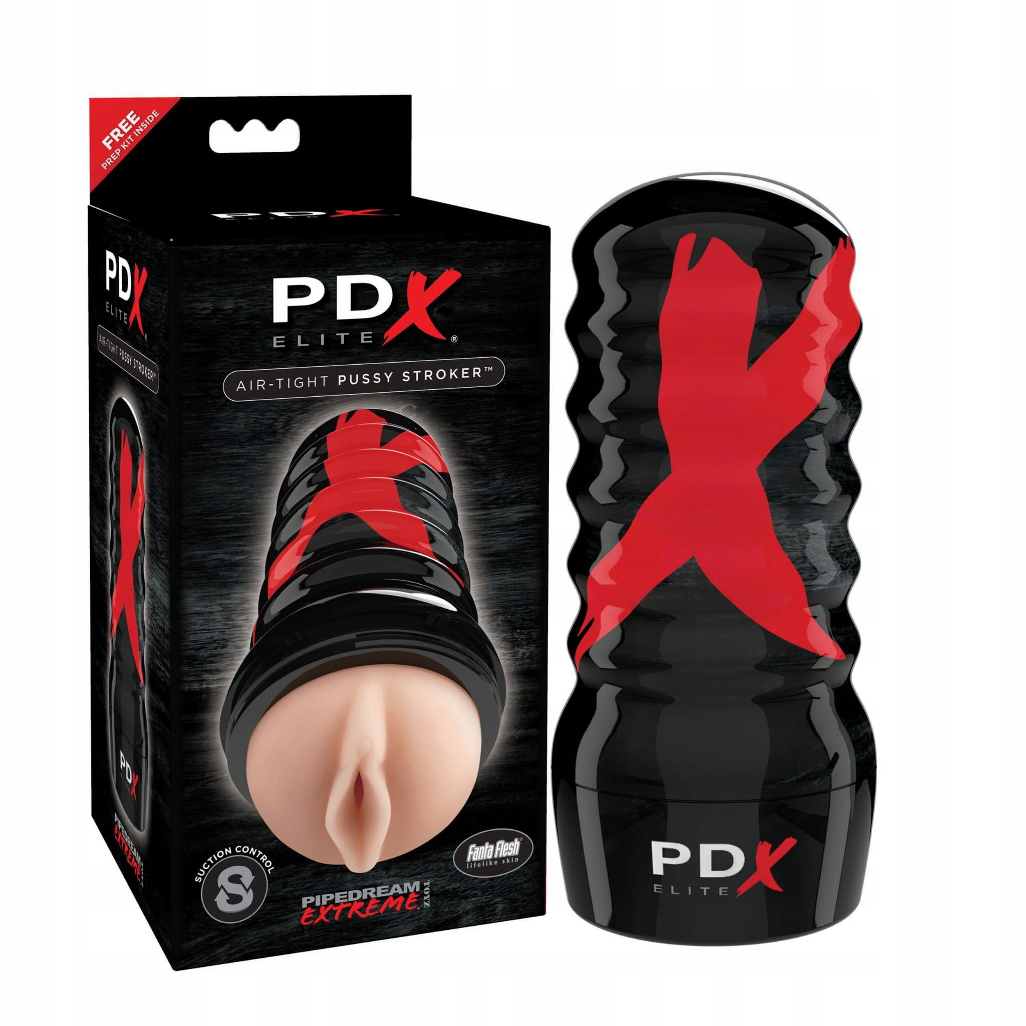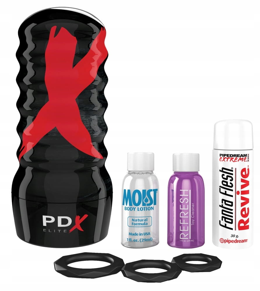 PDX Elite Air-Tight Pussy Stroker zapewni Ci najlepsze doznania podczas masturbacji - tak jak seks z prawdziwą kobietą ! Dzięki wygodnej i wytrzymałej, żebrowanej obudowie zewnętrznej zapewniającej solidny chwyt, PDX Elite Air-Tight Pussy Stroker tworzy mocne ssanie, które zassie każdy centymetr Twojego fiuta. Wewnętrzny rękaw masturbatora jest wykonany z opatentowanego materiału Fanta Flesh, który do złudzenia przypomina ludzką skórę i jest pokryty wypustkami i żebrowaniem. Na pewno spełni Twoje największe fantazje za każdym uderzeniem. Bardzo szybko przyjmuje temperaturę ciała zapewniając niesamowicie realistyczne wrażenia. Obudowa masturbatora ma dodatkowy otwór próżniowy dla uzyskania zróżnicowanego efektu ssania. Aby uzyskać różne stymulujące wrażenia usuń naklejkę kontrolną ssania i kciukiem dostosuj jej poziom. Masturbator zawiera dodatkowo 3 silikonowe pierścienie na penisa o różnej średnicy. Instrukcja użytkowania i czyszczenia : Używaj wraz z gadżetem tylko lubrykantów na bazie wody. Po użyciu wyjmij rękaw masturbatora z obudowy i wyczyścić dokładnie przy użyciu ciepłej wody i łagodnego mydła lub środka typu Toy Cleaner. Wytrzyj i pozostaw do całkowitego wyschnięcia. Aby zachować oryginalną miękkość i delikatność wkładu Fanta Flesh pamiętaj o regularnym stosowaniu pudru do cyberskóry lub innego środka służącego do pielęgnacji cyberskóry.