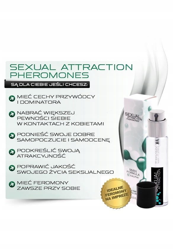 Dzięki pomocy feromonów Sexual Attraction Pheromones podkreślisz swoją osobowość i atrakcyjność. Stworzysz stanowisko samca alfa - przywódcy godnego podziwu i zaufania, oraz sprawisz, że kobiety będą bardziej otwarte i skore do flirtu. Zmieni się również Twoje samopoczucie, gdyż będziesz bardziej pewny siebie. Sexual Attraction Pheromones Man to silne feromony, które zrobią z Ciebie najbardziej pożądanego mężczyznę ! Możliwe jest to dzięki zawartości tych feromonów w naszych perfumach :