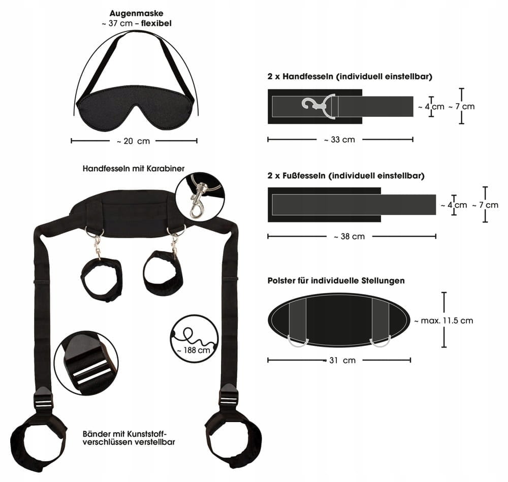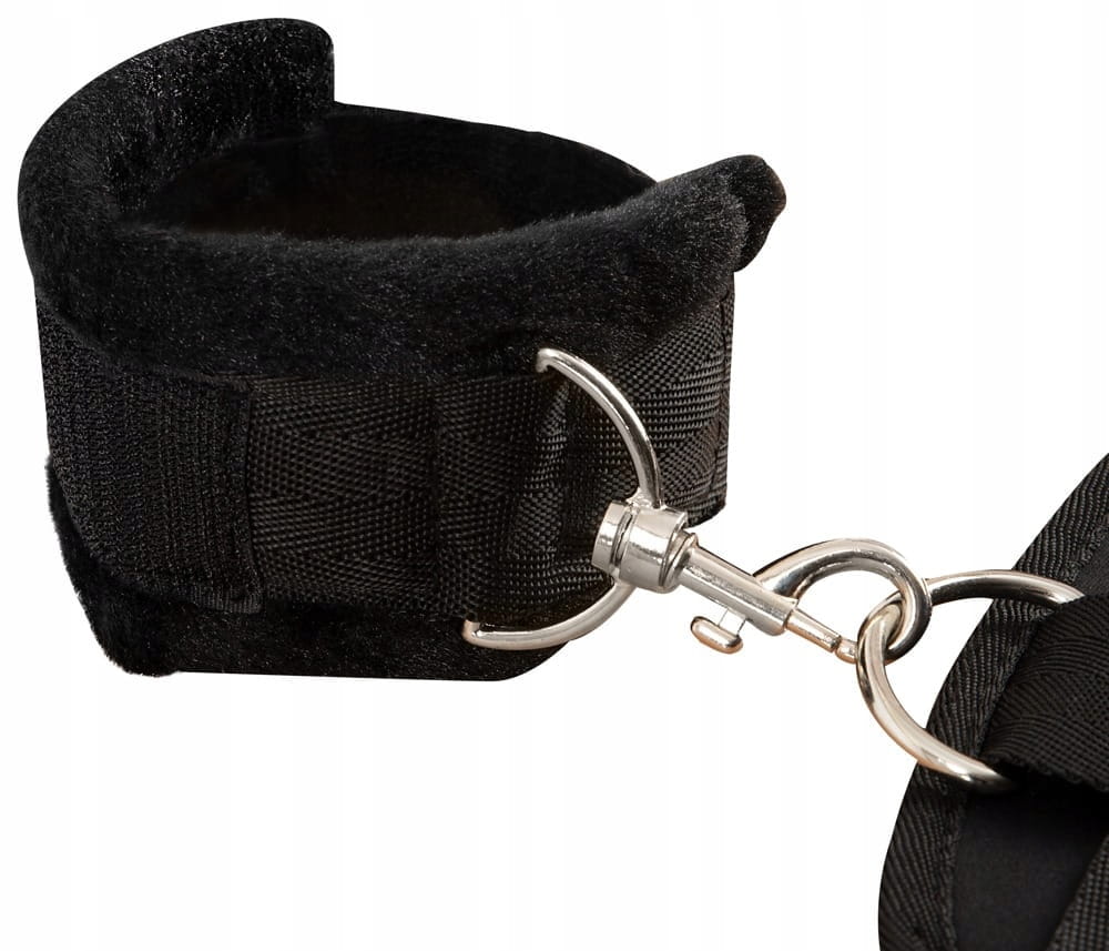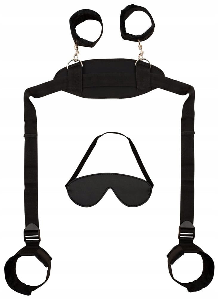 MIĘKKA UPRZĄŻ NA SZYJĘ NADGARSTKI I KOSTKI Z MASKĄ NA OCZYDla efektywnego zniewolenia całego ciała ! Połączone wiązanie na szyję, nadgarstki i kostki. Kajdanki w formie wygodnych mankietów są wyściełane miękkim pluszem i można je łatwo dopasować za pomocą mocnych zapięć na rzepy, aby uzyskać idealne dopasowanie. Długość pasa łączącego, który prowadzi do kajdanek na kostkach, można regulować. Kajdanki na nadgarstki są wyposażone w karabińczyki i można je wypiąć z uprzęży do innych zabaw solo. Stabilna, odporna na rozdarcia jakość wykorzystanego w uprzęży materiału wytrzymuje nawet najdziksze zabawy związane z krępowaniem ! Dzięki takiemu połączeniu elementów ograniczających, ekscytujące krępowanie całego ciała, w różnych pozycjach, jest możliwe w mgnieniu oka. Miękko wyściełane kajdanki dają przyjemną zabawę w miłosną niewolę - nawet przez długi czas. Teraz załóż nieprzezroczystą maskę na oczy ( w zestawie ), która wyostrzy wszystkie Twoje zmysły i możesz rozpocząć niebezpiecznie wciągającą grę ... Po użyciu wyczyścisz uprząż wilgotną ściereczką. Poczekaj do jej całkowitego wyschnięcia przed schowaniem do opakowania. Materiał : Poliester, Polipropylen, PU, ABS, Metal, bez ftalanów Kolor : czarny Wymiary :