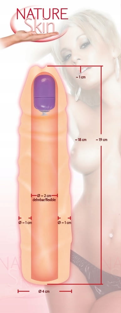 Poznaj najnowsze osiągnięcie naukowców - Naturskin, która jest bardziej naturalna niż prawdziwa ludzka skóra ! Materiał tak delikatny i "żywy" jakiego dotąd nie było. Super realistyczna nakładka na penisa w kolorze cielistym marki Nature Skin wykonana z wyjątkowego materiału, który doskonale imituje jędrną, miękką ludzką skórę ( TPR ). Odkryj niesamowicie naturalne doznania, jakie niesie gorąca zabawa z tym gadżetem. Ta nakładka jest niesamowita, ponieważ oprócz tego, że ma wyraźnie wyczuwalne wypukłości i żyły, tak jak na prawdziwym członku, to dodatkowo wewnątrz tunelu znajdują się stymulujące, dające dodatkową przyjemność dla Ciebie rowki. Wewnątrz nakładki, na jej końcu znajduje się wyjmowany pocisk wibrujący. Mini wibrator sterowany jest dotykiem - zaczyna działać w tym momencie, gdy Twoje prącie zaczyna naciskać na niego. NATURE SKIN jest to niezwykle realistyczny materiał, który posiada jednocześnie dwie właściwości. Z zewnątrz jest miękki i delikatny, tak iż zamykając oczy i dotykając go, trudno oprzeć się wrażeniu, iż dotyka się prawdziwej, jędrnej i delikatnej ludzkiej skóry. Z drugiej strony, wnętrze materiału jest odpowiednio sztywne i twarde. Z NATURE SKIN wykonane są jedynie nieliczne akcesoria erotyczne. W przypadku produktów wykonanych w technologii Nature Skin należy pamiętać, aby każdorazowo po użyciu, umyć zabawkę, osuszyć, a następnie oprószyć delikatnie talkiem do konserwacji cyberskóry.