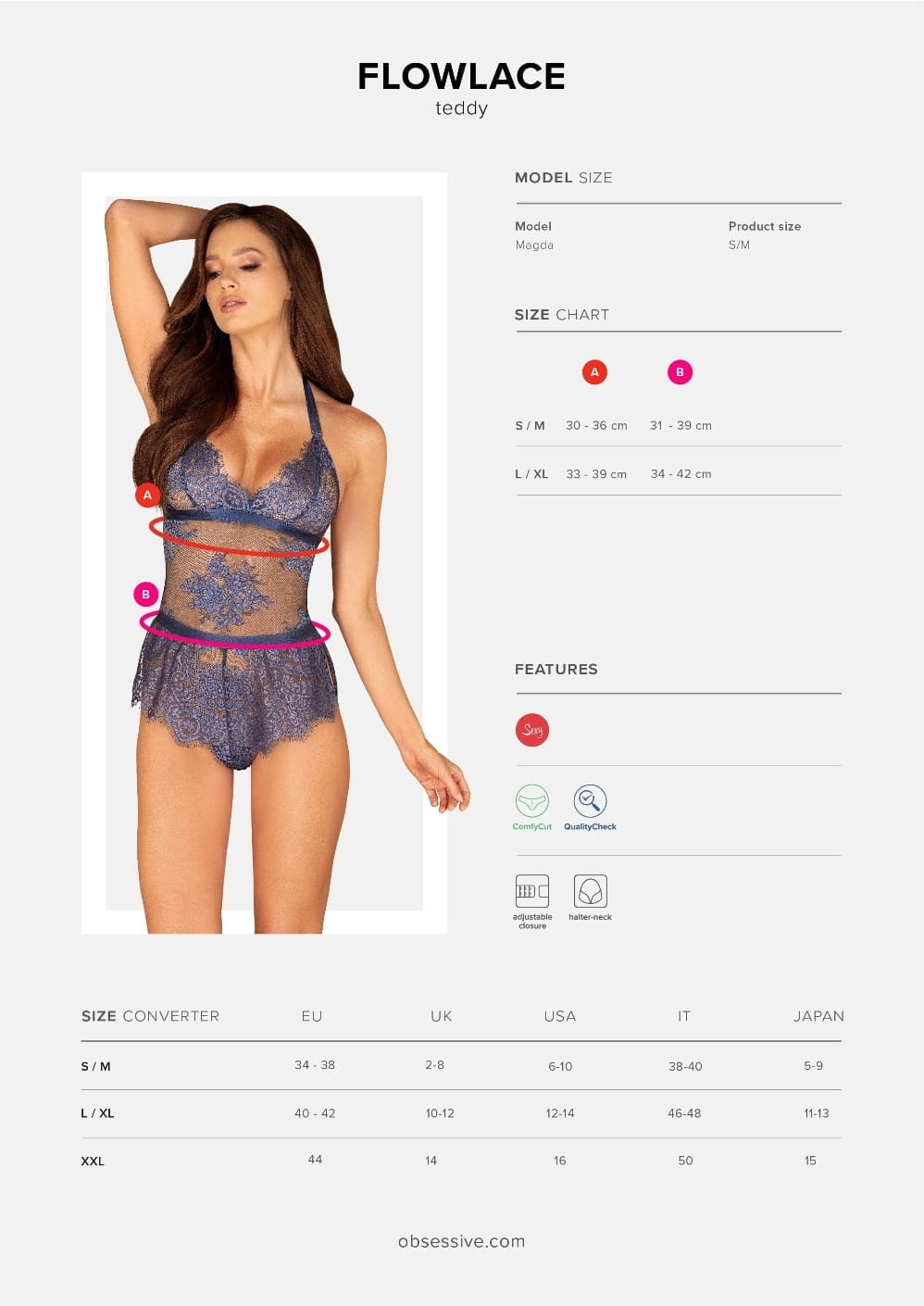 Tu jest jak w niebie ! Szczypta niebieskiej rozkoszy połączona z koronką, to przepis na seksowną bieliznę, która wydobędzie 100% Twojego naturalnego uroku. Poczuj się jak prawdziwa kusicielka i pokaż swojemu mężczyźnie, co go dzisiaj czeka ! Nie musisz już dłużej szukać idealnej bielizny. Uroczy kolor, elegancka baskinka i to coś ... satynowe wiązanie na szyi – zobacz, jak pięknie się prezentuje! Flowlace jest idealne także na mały biust. Podkreśl piękno swoich piersi, nawet tych o mniejszym rozmiarze, a komfort i fenomenalny wygląd dostaniesz w pakiecie. Kusi, prawda ? To model idealny dla figlarnych romantyczek. Sprawiliśmy, że Twoje marzenie o perfekcyjnym body się spełniło. Teraz Ty leć spełnić Wasze miłosne fantazje !