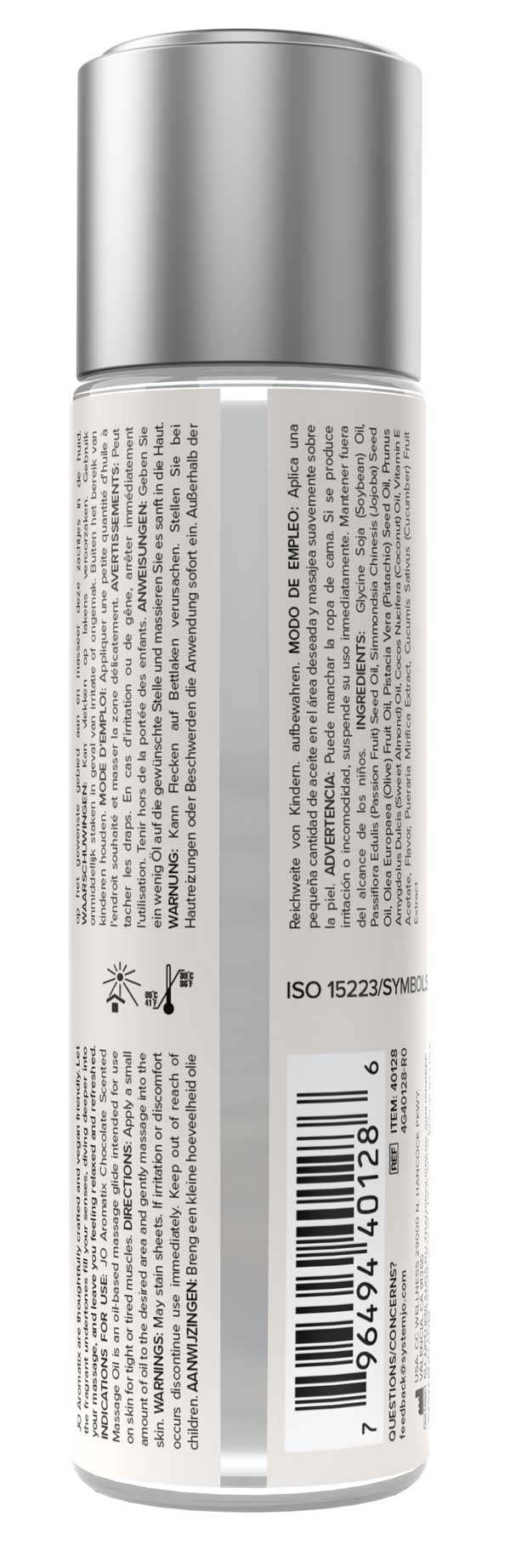 Olejek do masażu System JO® Aromatix o zapachu czekoladowym to produkt wysokiej jakości, który gwarantuje uczucie odświeżenia i odprężenia. Kluczowe składniki produktu to witamina E, olej jojoba, słodki olejek migdałowy, a także olej kokosowy. Zalety: