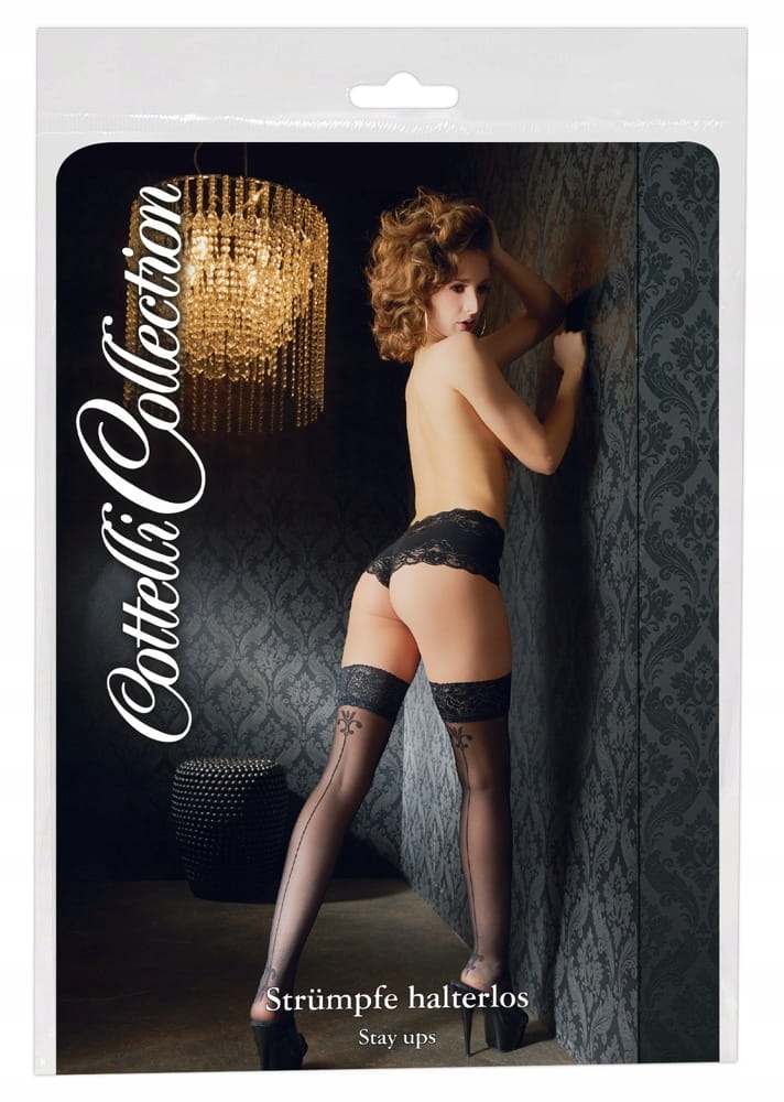 Szalenie kobiece pończochy samonośne z koronkowym topem i dekoracyjnymi przeszyciami.
