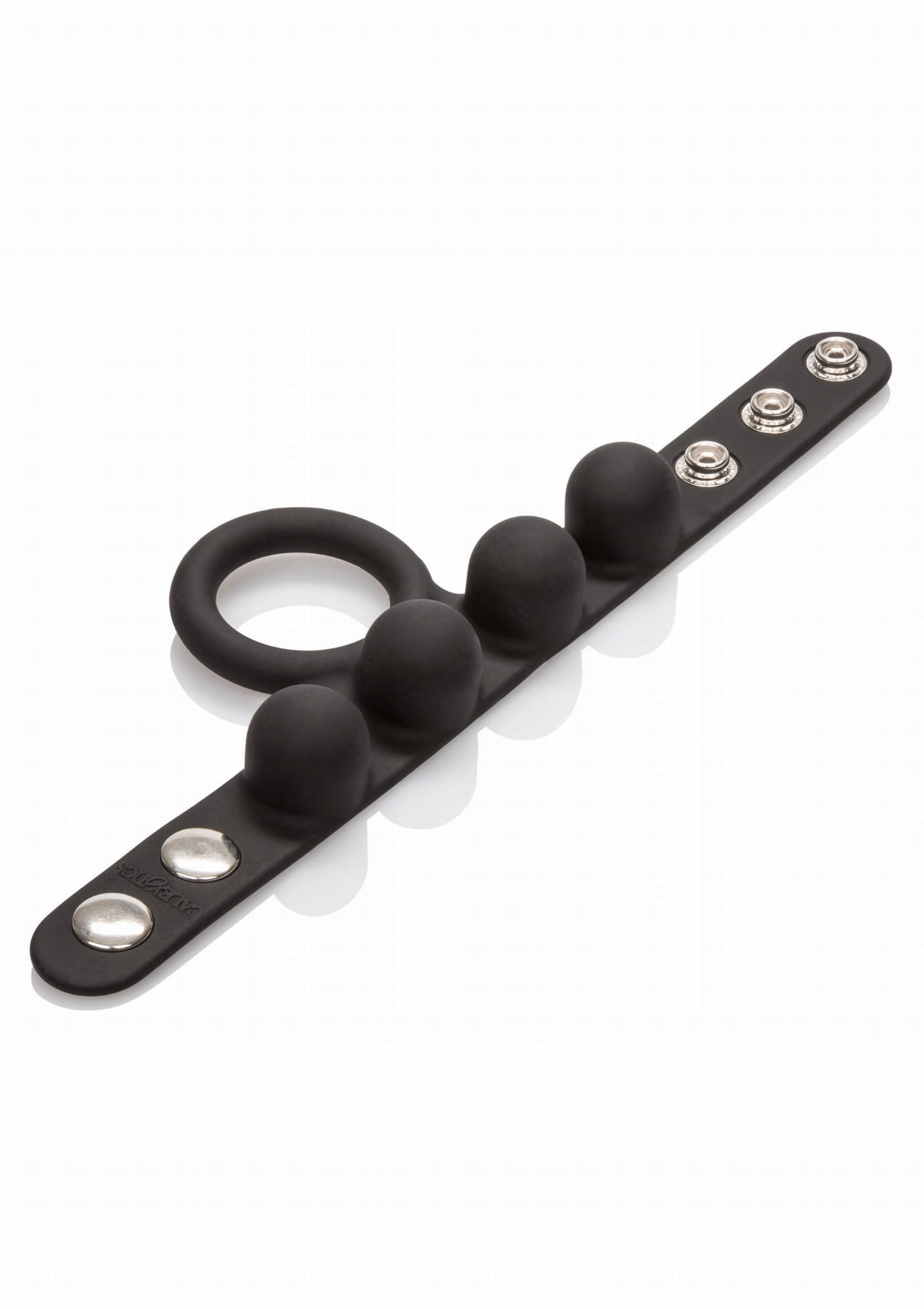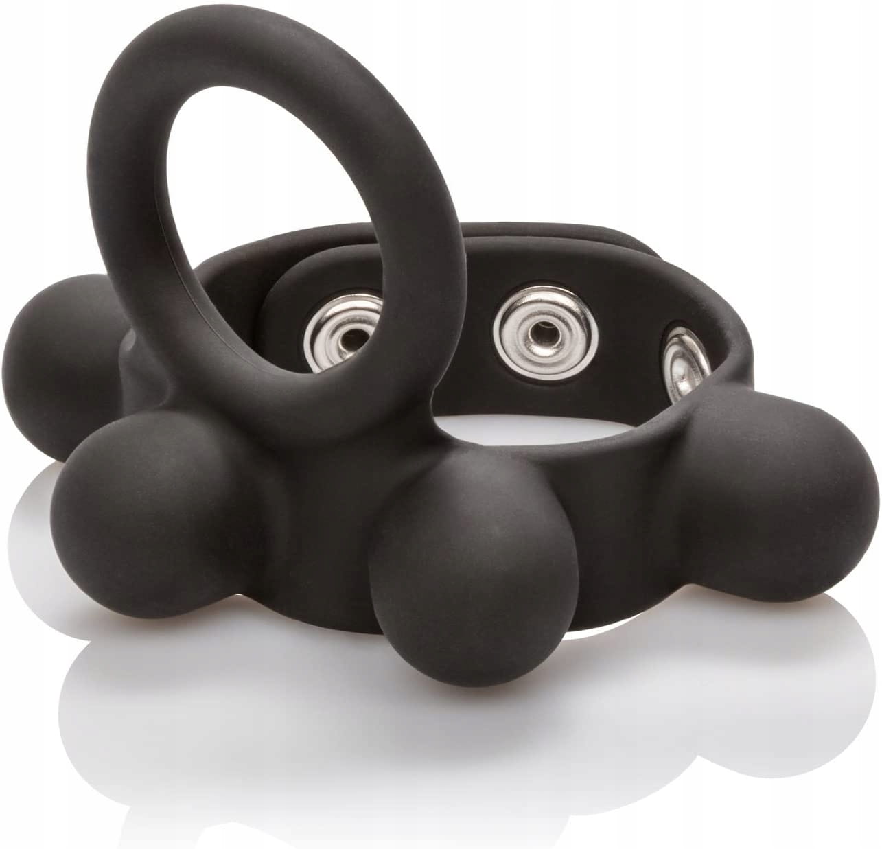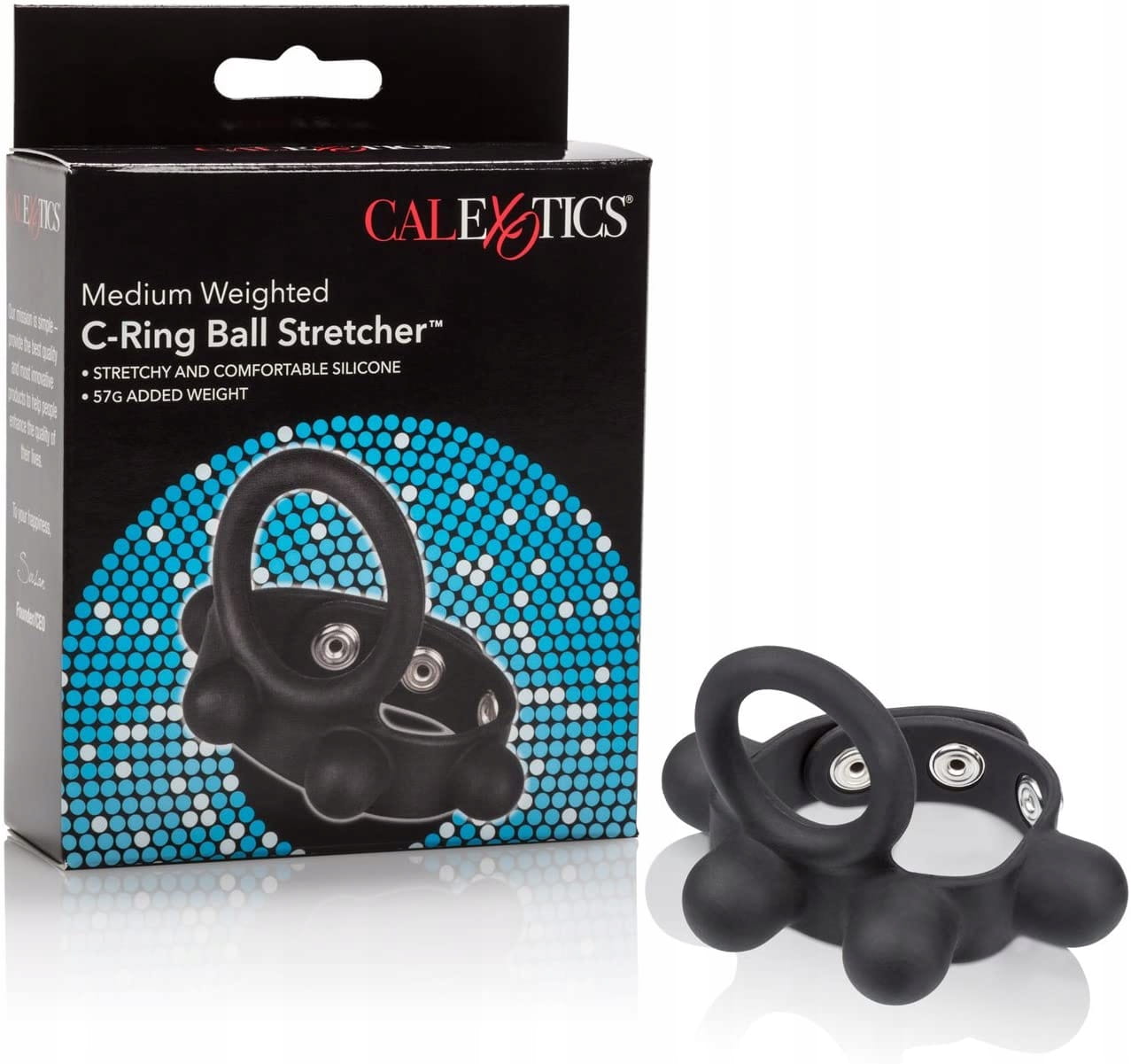 PIERŚCIEŃ NA PENISA WEIGHTED C RING BALL STRETCHER M - WAGA 57 GRAMWyjątkowy, podwójny pierścień erekcyjny na penisa z dodatkowym obciążeniem na jądra C-Ring Ball Stretcher Medium zapewni Ci jeszcze mocniejsze doznania ! Jedna część pierścienia jest zakładana na penisa, natomiast drugą zapina się na jądrach, co pozwala na znaczne przedłużenie trwania stosunku. Zapinana część posiada ukryte w dużych wypustkach obciążniki o całkowitej wadze 57 g. Dodatkowo jest ona regulowana, co pozwala na dopasowanie mocy ucisku na jądrach. Użycie pierścienia może zwiększyć siłę Twojej erekcji, oraz pomaga powstrzymać przedwczesny wytrysk. Zdobądź wsparcie, którego potrzebujesz, aby uzyskać super mocny orgazm przedłużając Waszą miłosną grę. Wypustki na pierścieniu dodatkowo stymulują łechtaczkę i waginę Partnerki. Pierścień jest elastyczny i bardzo dobrze dopasowuje się do obwodu każdego penisa dzięki zapinaniu na napy. Gadżet wykonany jest z aksamitnie gładkiego, w pełni bezpiecznego dla ciała silikonu medycznego, który po każdym użyciu wystarczy umyć ciepłą wodą z dodatkiem łagodnego mydła. Materiał : Silikon medyczny, żelazo, bez ftalanów Kolor : czarny Wymiary :