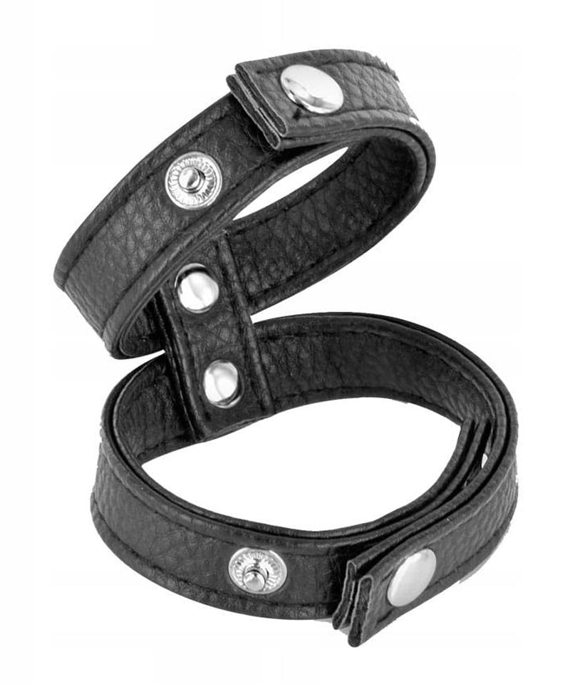 Podwójny, regulowany pierścień uciskowy na penisa i jądra. Pierścień został wykonany z wysokiej jakości sztucznej skóry. Średnicę pierścienia możesz regulować za pomocą metalowych zatrzasków.