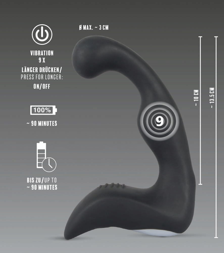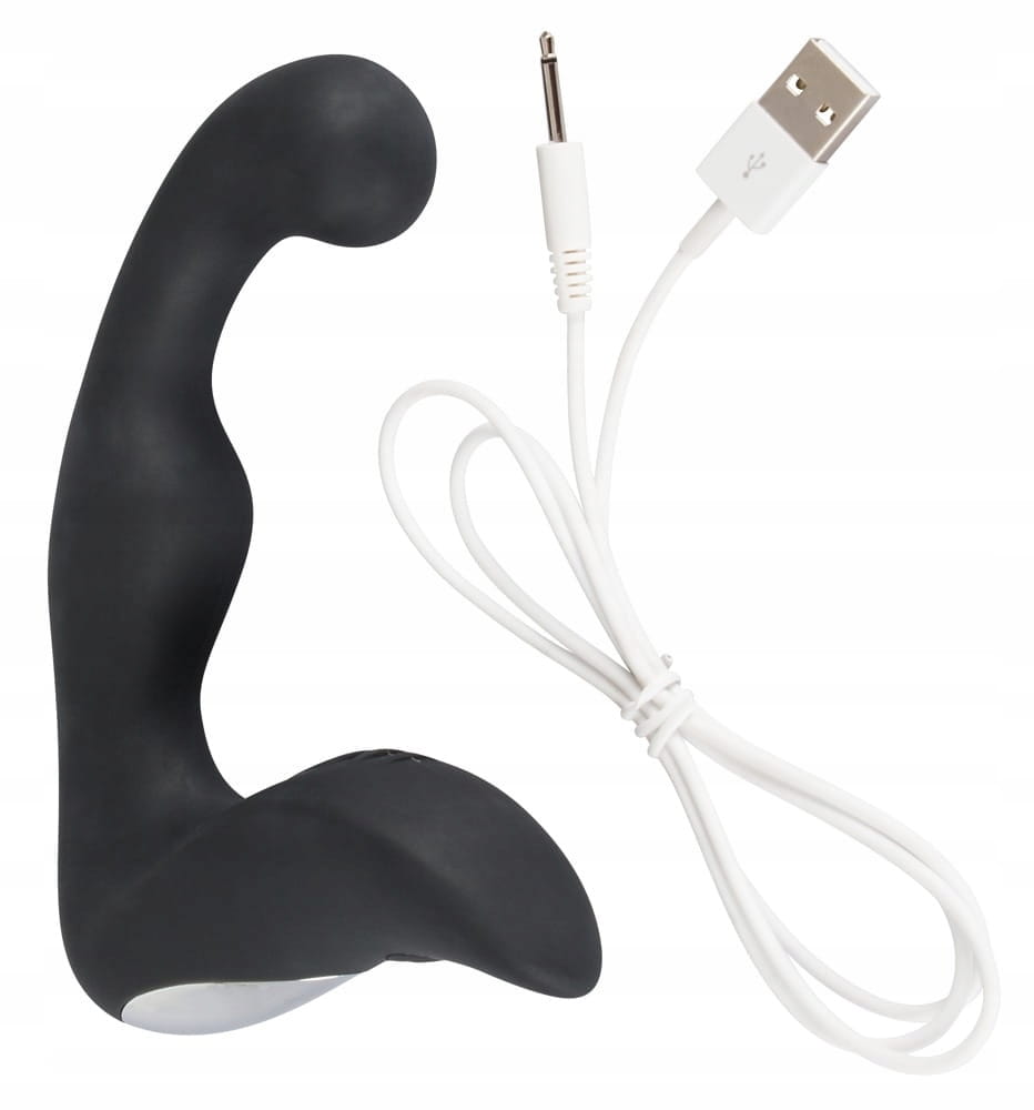 Elastyczny stymulator prostaty wykonany w całości z silikonu medycznego z lekko zakrzywioną końcówką główki, falistym trzonem i rowkowanym stymulatorem krocza. Do dyspozycji masz aż 9 trybów silnych i cichych wibracji. Prosty panel sterowania w podstawie masażera posiada jeden przycisk służący do włączenia i wyłączenia masażera ( przytrzymaj przycisk przez ok. 3 sekundy ) oraz do zmiany wzoru wibracji. Masażer naładujesz za pomocą dołączonego kabla USB.