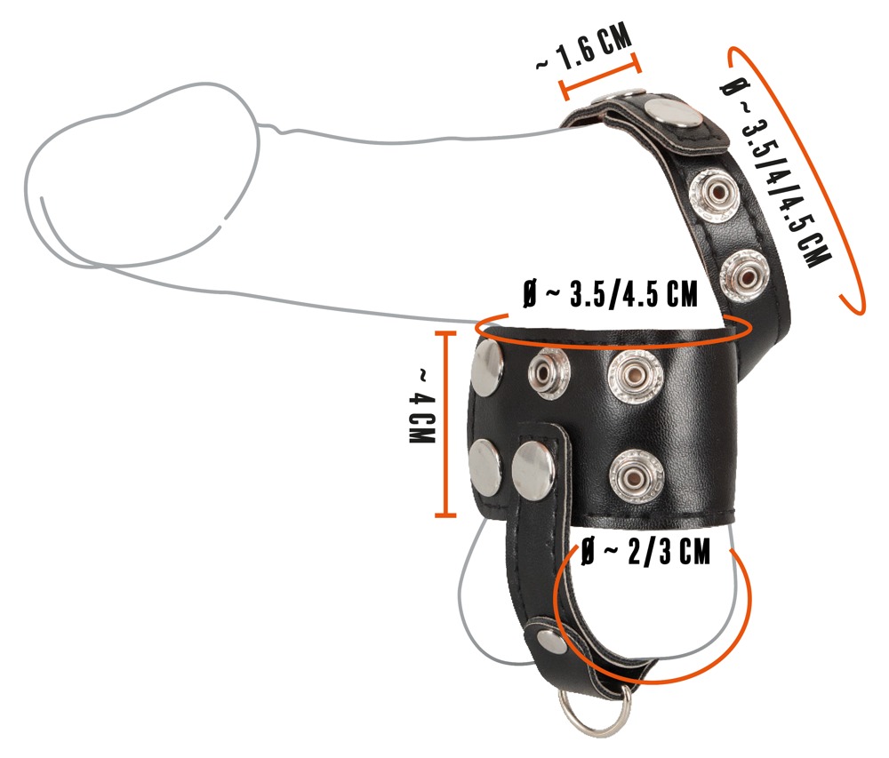 Dla silniejszej i dłuższej erekcji, oraz pobudzającego rozciągania jąder ! Czarny pasek na penisa i jądra z separatorem w bardzo męskim stylu. Pierścień w kształcie litery D na separatorze jąder może służyć do zapinania ciężarka ( brak w zestawie ) lub smyczy podczas zabaw BDSM w uległość ( brak w zestawie ). Zatrzaski ułatwiają szybkie zakładanie, zdejmowanie i regulację wszystkich pasków i separatora, dając idealne oraz mocne i bezpieczne dopasowanie. Szeroki pasek ściśle otacza jądra i zapewnia bardzo przyjemne rozciąganie, które można wzmocnić, mocując ciężarki. W tym samym czasie pasek na penisie doskonale przylega dając efekt przekrwienia, dzięki czemu penis pozostaje dłużej sztywny i gotowy do akcji. Paski wykonane są z miękkiej imitacji skóry dla optymalnego komfortu noszenia i przyjemnego uczucia na skórze, oraz atrakcyjnie męskiego wyglądu ! Jak używać paska na penisa i jądra ? Otwórz zatrzaski i załóż wąski pasek na penisa, a szeroki na jądra. Następnie umieść rozdzielacz między jądrami i zamknij wszystko zatrzaskami. Gadżet ma wygląd czarnej skóry i wygląda naprawdę mocnie dzięki błyszczącym srebrnym zatrzaskom ! Możesz go dyskretnie nosić pod ubraniem i rozciągać jądra w dowolnym miejscu i czasie. Szczególnie ekscytujące jest noszenie rozciągacza na jądra wraz z paskiem na penisa podczas masturbacji lub seksu. Twoje klejnoty są cudownie i szczelnie zamknięte i ciągle stymulowane - wypróbuj !
