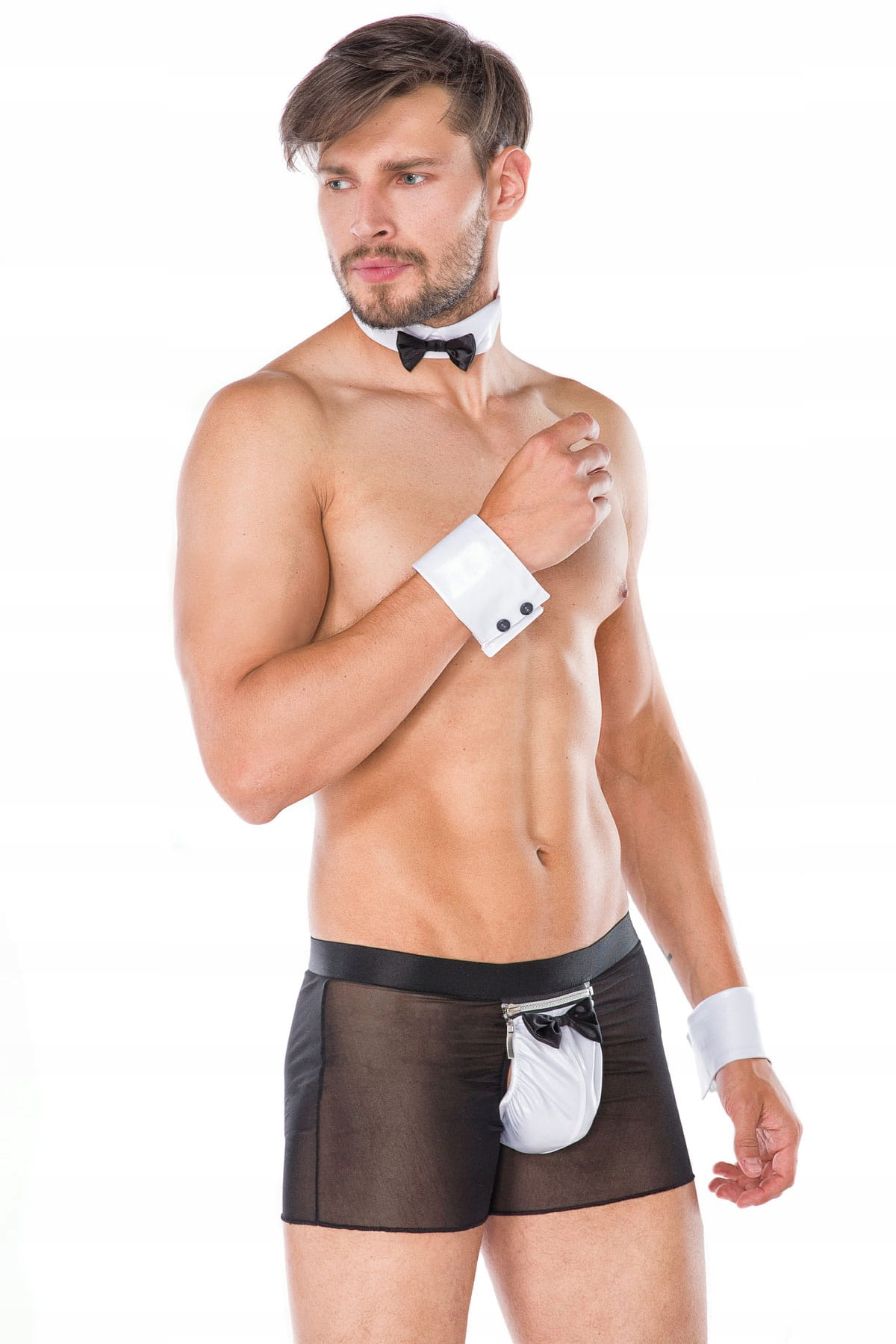 Erotyczny kostium kelnera składający się z zapinanych na rzepy, białych, mankietów, również zapinanego na rzep białego kołnierzyka z czarną muszką wykonanych z białego materiału wetlook oraz bokserek wykonanych z białej dzianiny wetlook połączonej z czarną transparentną dzianiną.