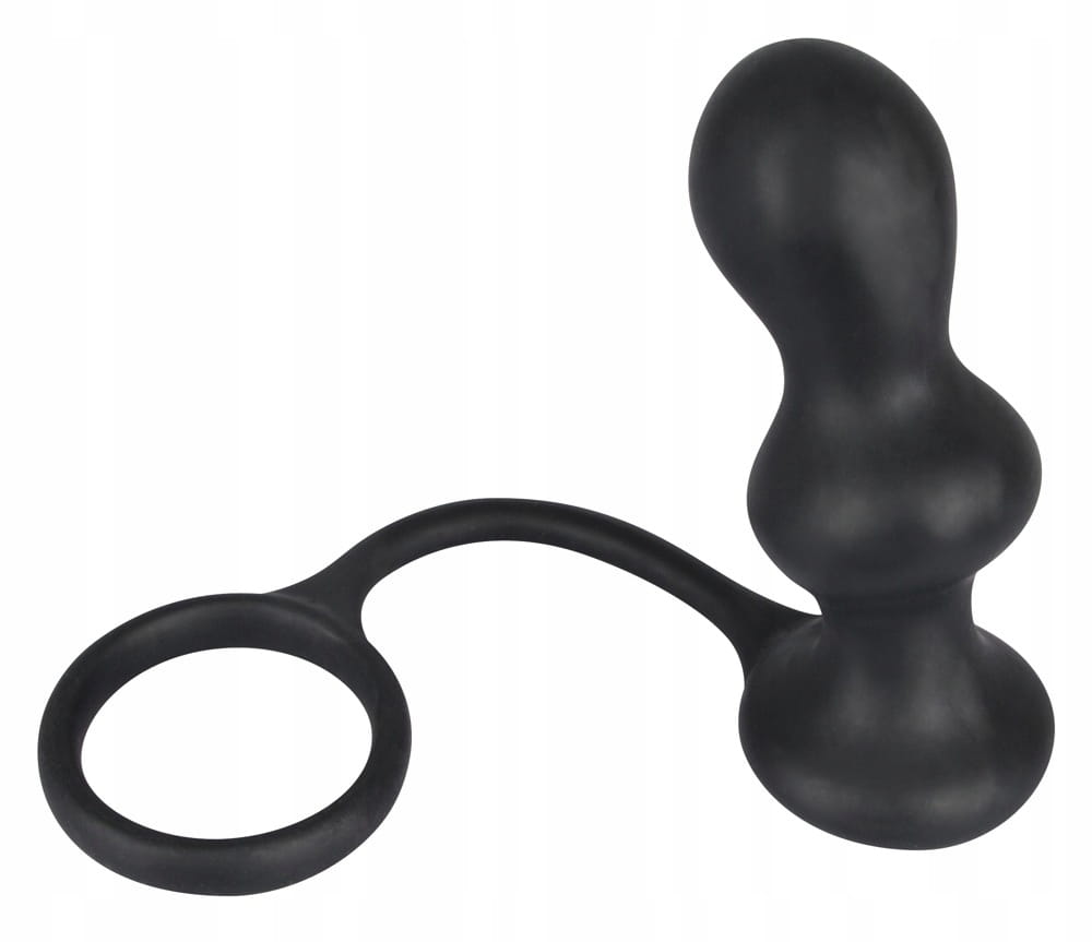 - lekko zakrzywiony korek z dwoma dużymi kulkami i zintegrowanym pierścieniem na penisa na silikonowym sznureczku