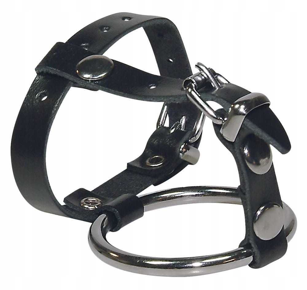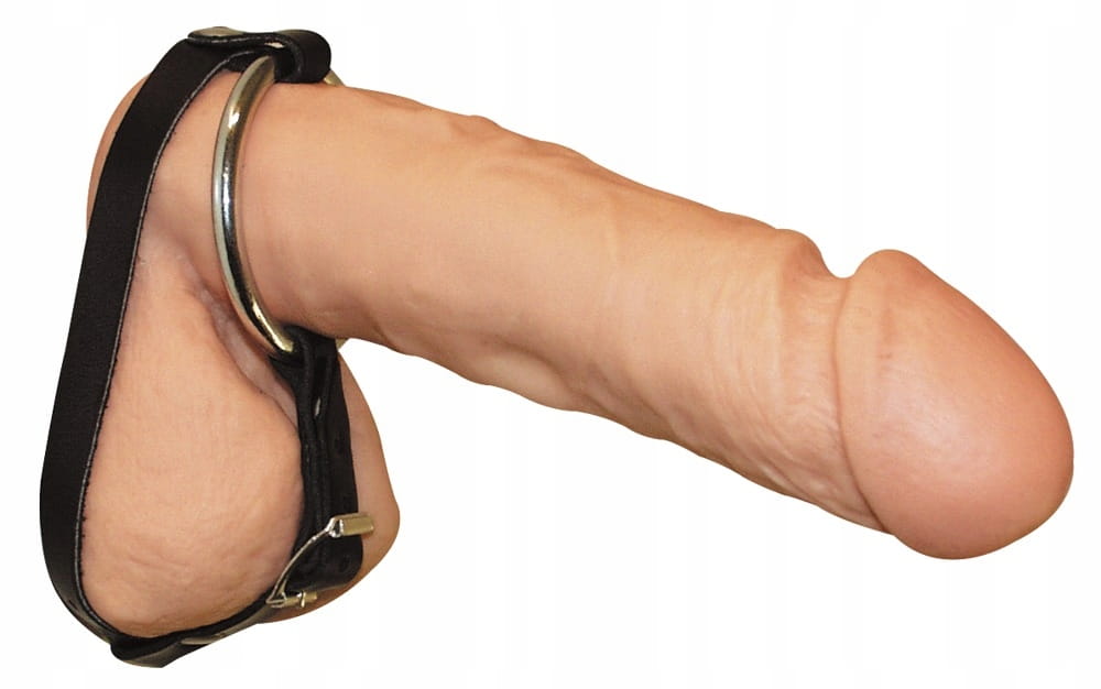 Składa się z efektownej, skórzanej opaski uciskowej na jądra z regulowanym zapięciem, oraz metalowego ringu na penisa.