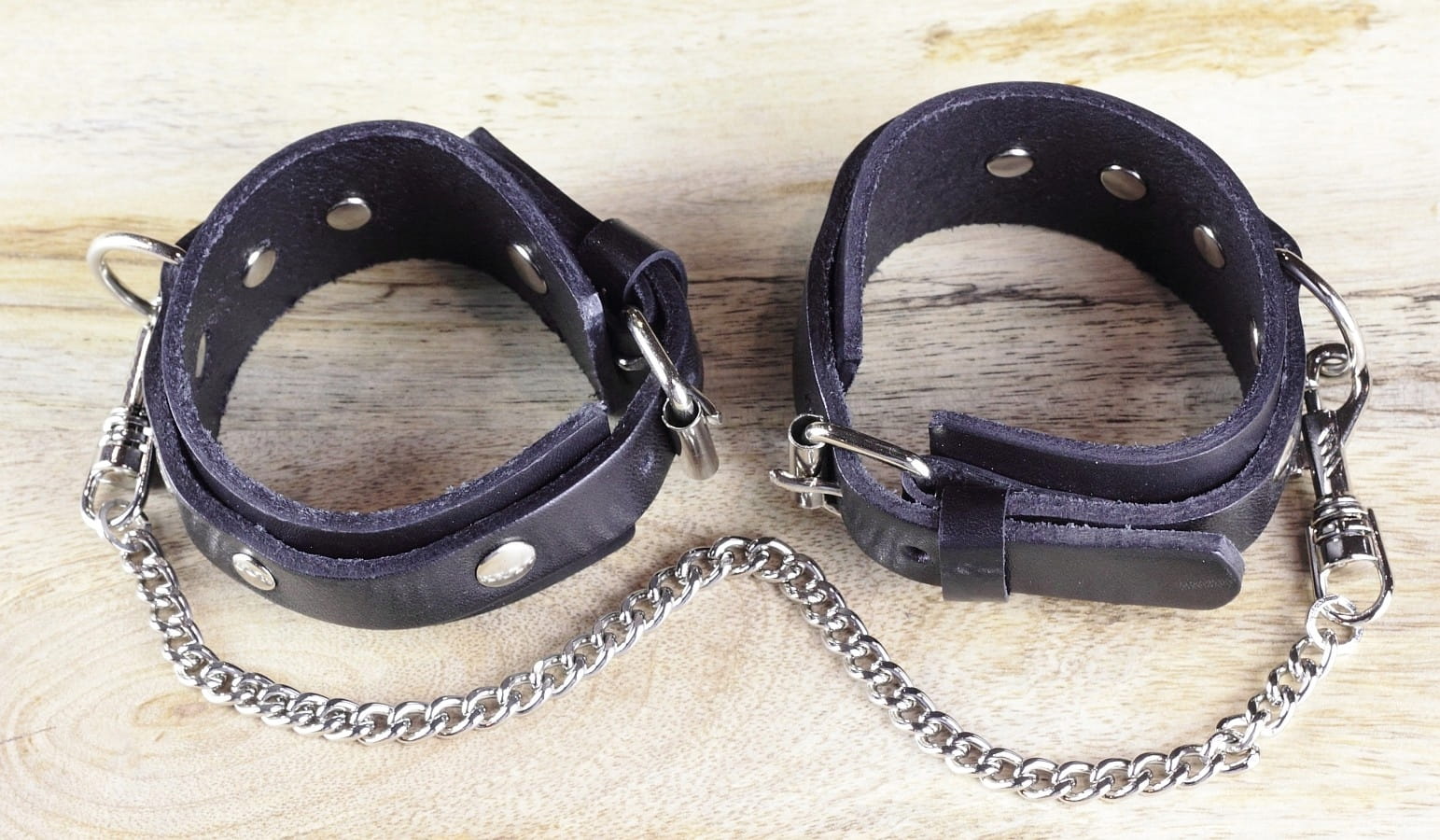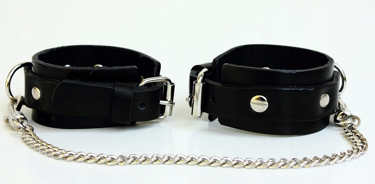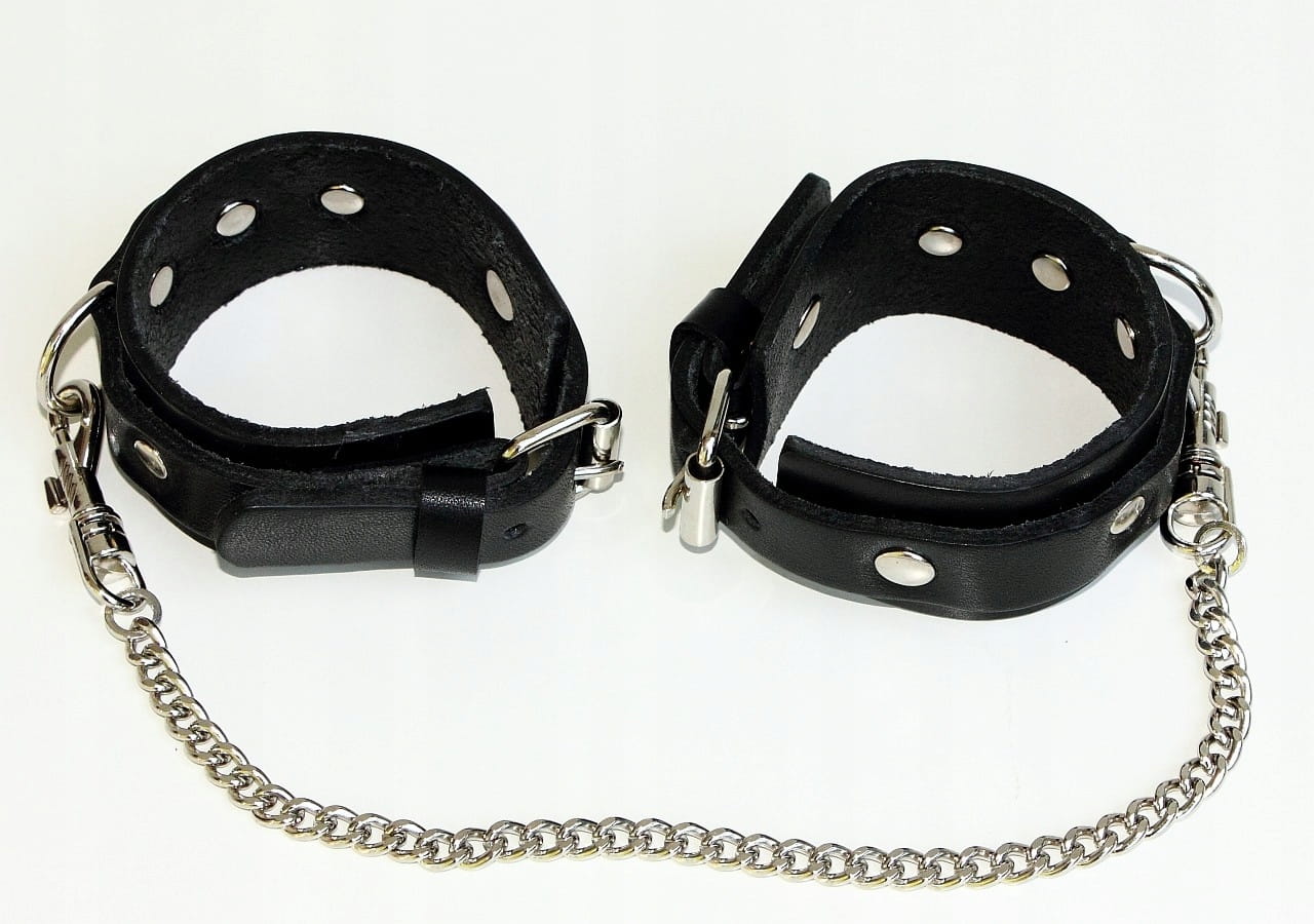 Skórzane męskie kajdanki w kolorze czarnym zapinane na masywne klamry.