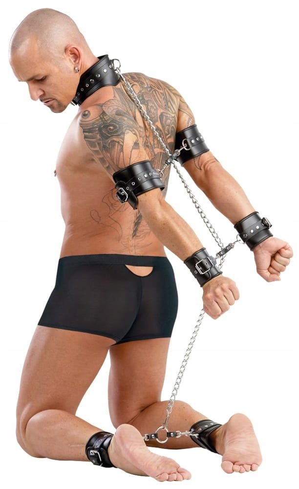 Obroża, 2 naramienniki oraz kajdanki na ręce i na nogi, połączone ze sobą długim, łańcuchem (1m).