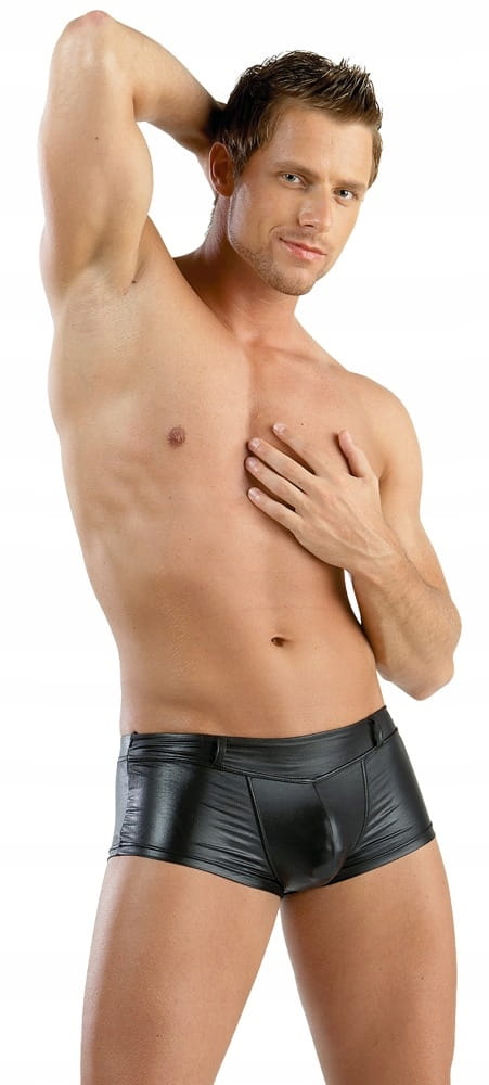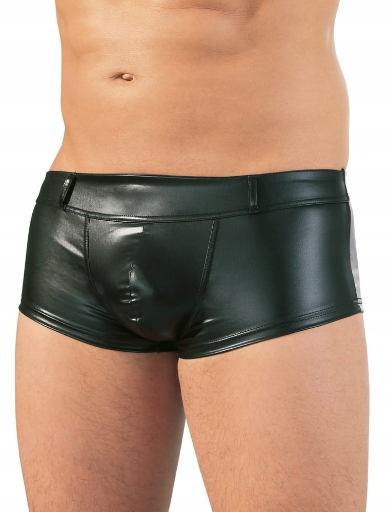 Super przylegające do ciała bokserki z nabłyszczanej tkaniny typu Wetlook tzw. mokrej.